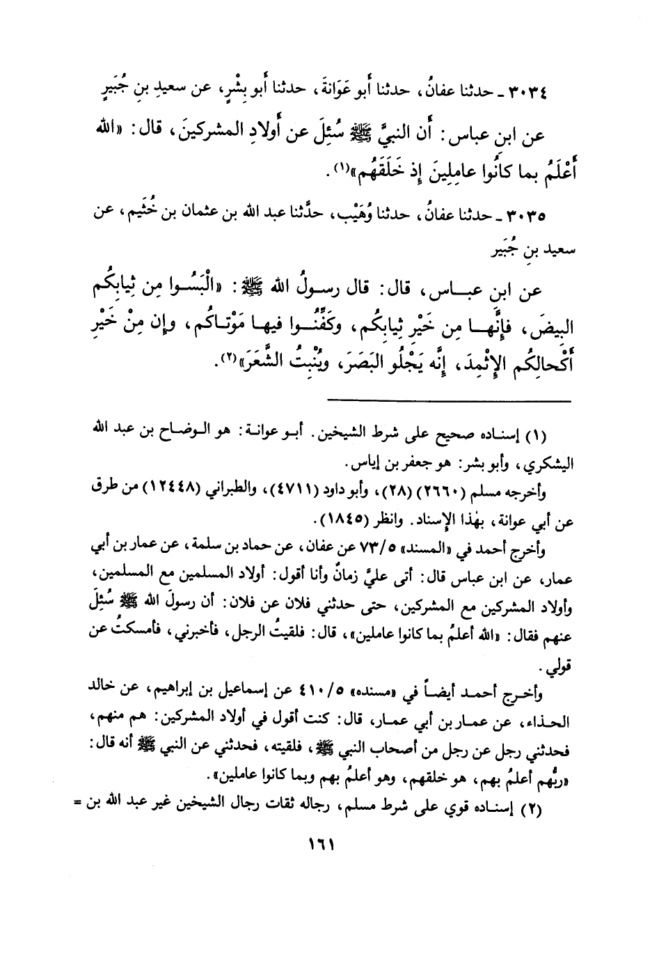 ٣٠٣٤ - حَدَّثَنَا عَفَّانُ، حَدَّثَنَا أَبُو عَوَانَةَ، حَدَّثَنَا أَبُو بِشْرٍ، عَنْ سَعِيدِ بْنِ جُبَيْرٍ، عَنِ ابْنِ عَبَّاسٍ: أَنَّ النَّبِيَّ صَلَّى اللهُ عَلَيْهِ وَسَلَّمَ، سُئِلَ عَنْ أَوْلَادِ الْمُشْرِكِينَ، قَالَ: " اللهُ أَعْلَمُ بِمَا كَانُوا عَامِلِينَ إِذْ خَلَقَهُمْ " (١) .