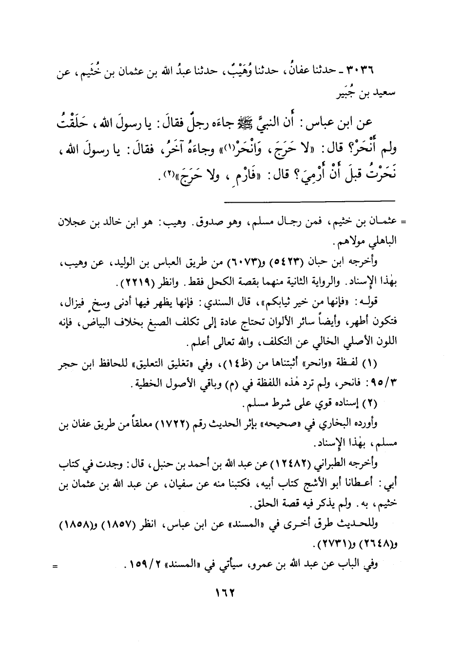 ٣٠٣٦ - حَدَّثَنَا عَفَّانُ، حَدَّثَنَا وُهَيْبٌ، حَدَّثَنَا عَبْدُ اللهِ بْنُ عُثْمَانَ بْنِ خُثَيْمٍ، عَنْ سَعِيدِ بْنِ جُبَيْرٍ، عَنِ ابْنِ عَبَّاسٍ: أَنَّ النَّبِيَّ صَلَّى اللهُ عَلَيْهِ وَسَلَّمَ جَاءَهُ رَجُلٌ فَقَالَ: يَا رَسُولَ اللهِ، حَلَقْتُ وَلَمْ أَنْحَرْ؟ قَالَ: " لَا حَرَجَ وَانْحَرْ (١) " وَجَاءَهُ آخَرُ، فَقَالَ: يَا رَسُولَ اللهِ، نَحَرْتُ قَبْلَ أَنْ أَرْمِيَ؟ قَالَ: " فَارْمِ، وَلَا حَرَجَ " (٢) .