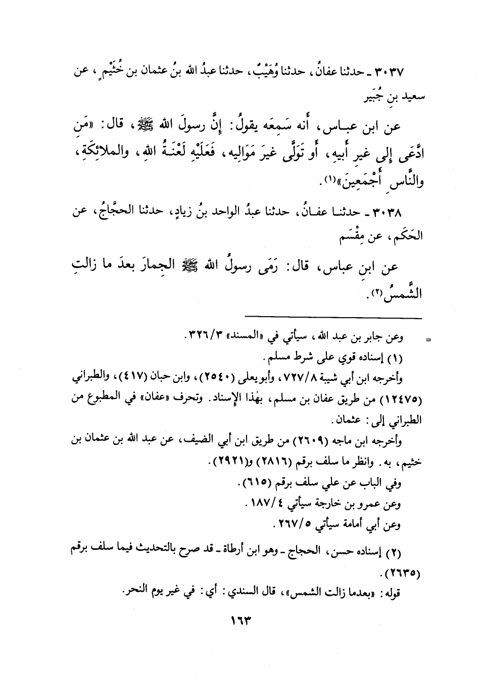 ٣٠٣٧ - حَدَّثَنَا عَفَّانُ، حَدَّثَنَا وُهَيْبٌ، حَدَّثَنَا عَبْدُ اللهِ بْنُ عُثْمَانَ بْنِ خُثَيْمٍ، عَنْ سَعِيدِ بْنِ جُبَيْرٍ، عَنِ ابْنِ عَبَّاسٍ، أَنَّهُ سَمِعَهُ يَقُولُ: إِنَّ رَسُولَ اللهِ صَلَّى اللهُ عَلَيْهِ وَسَلَّمَ، قَالَ: " مَنِ ادَّعَى إِلَى غَيْرِ أَبِيهِ، أَوْ تَوَلَّى غَيْرَ مَوَالِيهِ، فَعَلَيْهِ لَعْنَةُ اللهِ، وَالْمَلائِكَةِ، وَالنَّاسِ أَجْمَعِينَ " (١)