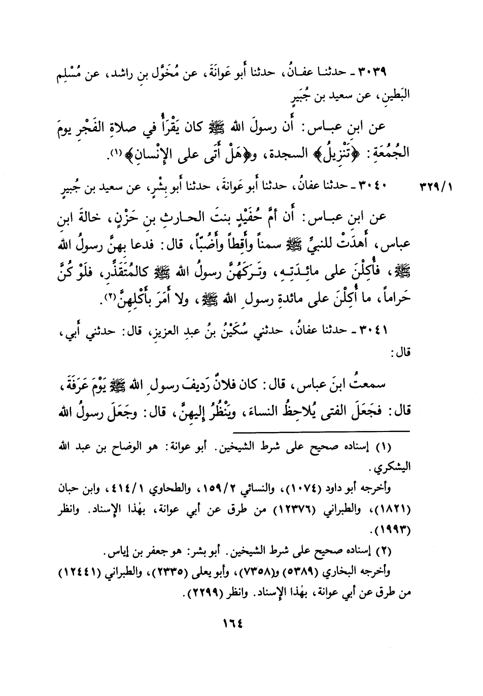 ٣٠٤٠ - حَدَّثَنَا عَفَّانُ، حَدَّثَنَا أَبُو عَوَانَةَ، حَدَّثَنَا أَبُو بِشْرٍ، عَنْ سَعِيدِ بْنِ جُبَيْرٍ، عَنِ ابْنِ عَبَّاسٍ: أَنَّ أُمَّ حُفَيْدٍ بِنْتَ الْحَارِثِ بْنِ حَزْنٍ، خَالَةَ ابْنِ عَبَّاسٍ، أَهْدَتْ لِلنَّبِيِّ صَلَّى اللهُ عَلَيْهِ وَسَلَّمَ سَمْنًا وَأَقِطًا وَأَضُبًّا، قَالَ: " فَدَعَا بِهِنَّ رَسُولُ اللهِ صَلَّى اللهُ عَلَيْهِ وَسَلَّمَ، فَأُكِلْنَ عَلَى مَائِدَتِهِ، وَتَرَكَهُنَّ رَسُولُ اللهِ صَلَّى اللهُ عَلَيْهِ وَسَلَّمَ كَالْمُتَقَذِّرِ " " فَلَوْ كُنَّ حَرَامًا، مَا أُكِلْنَ عَلَى مَائِدَةِ رَسُولِ اللهِ صَلَّى اللهُ عَلَيْهِ وَسَلَّمَ، وَلا أَمَرَ بِأَكْلِهِنَّ " (٢)