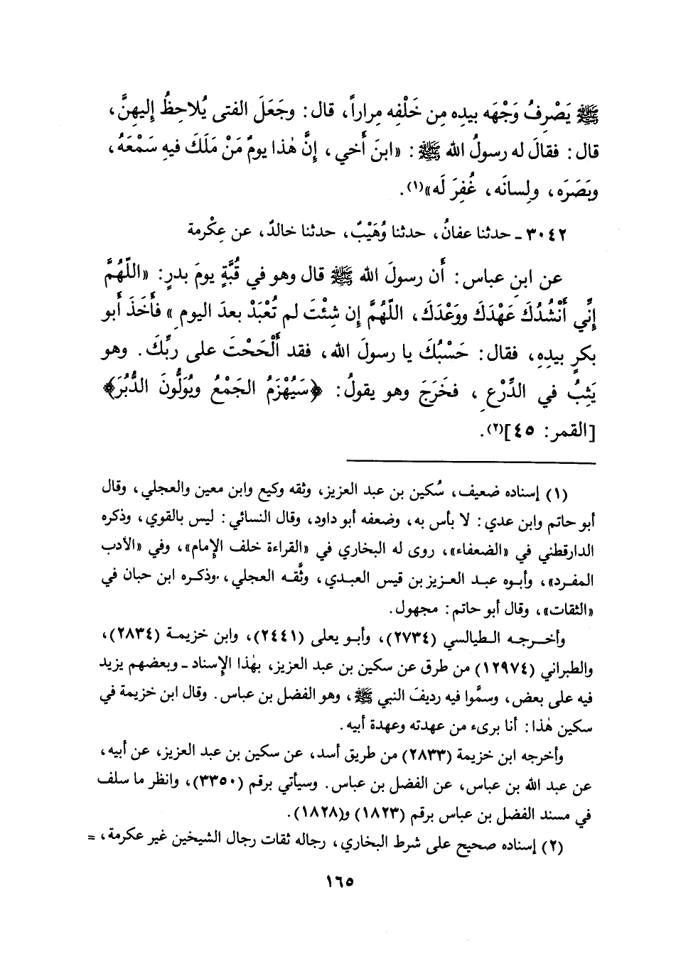 ٣٠٤٢ - حَدَّثَنَا عَفَّانُ، حَدَّثَنَا وُهَيْبٌ، حَدَّثَنَا خَالِدٌ، عَنْ عِكْرِمَةَ، عَنِ ابْنِ عَبَّاسٍ، أَنَّ رَسُولَ اللهِ صَلَّى اللهُ عَلَيْهِ وَسَلَّمَ قَالَ وَهُوَ فِي قُبَّةٍ يَوْمَ بَدْرٍ: " اللهُمَّ إِنِّي أَنْشُدُكَ عَهْدَكَ وَوَعْدَكَ، اللهُمَّ إِنْ شِئْتَ لَمْ تُعْبَدْ بَعْدَ الْيَوْمِ " فَأَخَذَ أَبُو بَكْرٍ بِيَدِهِ، فَقَالَ: حَسْبُكَ يَا رَسُولَ اللهِ، فَقَدْ أَلْحَحْتَ عَلَى رَبِّكَ. وَهُوَ يَثِبُ فِي الدِّرْعِ، فَخَرَجَ وَهُوَ يَقُولُ: {سَيُهْزَمُ الْجَمْعُ وَيُوَلُّونَ الدُّبُرَ} [القمر: ٤٥] (٢) .