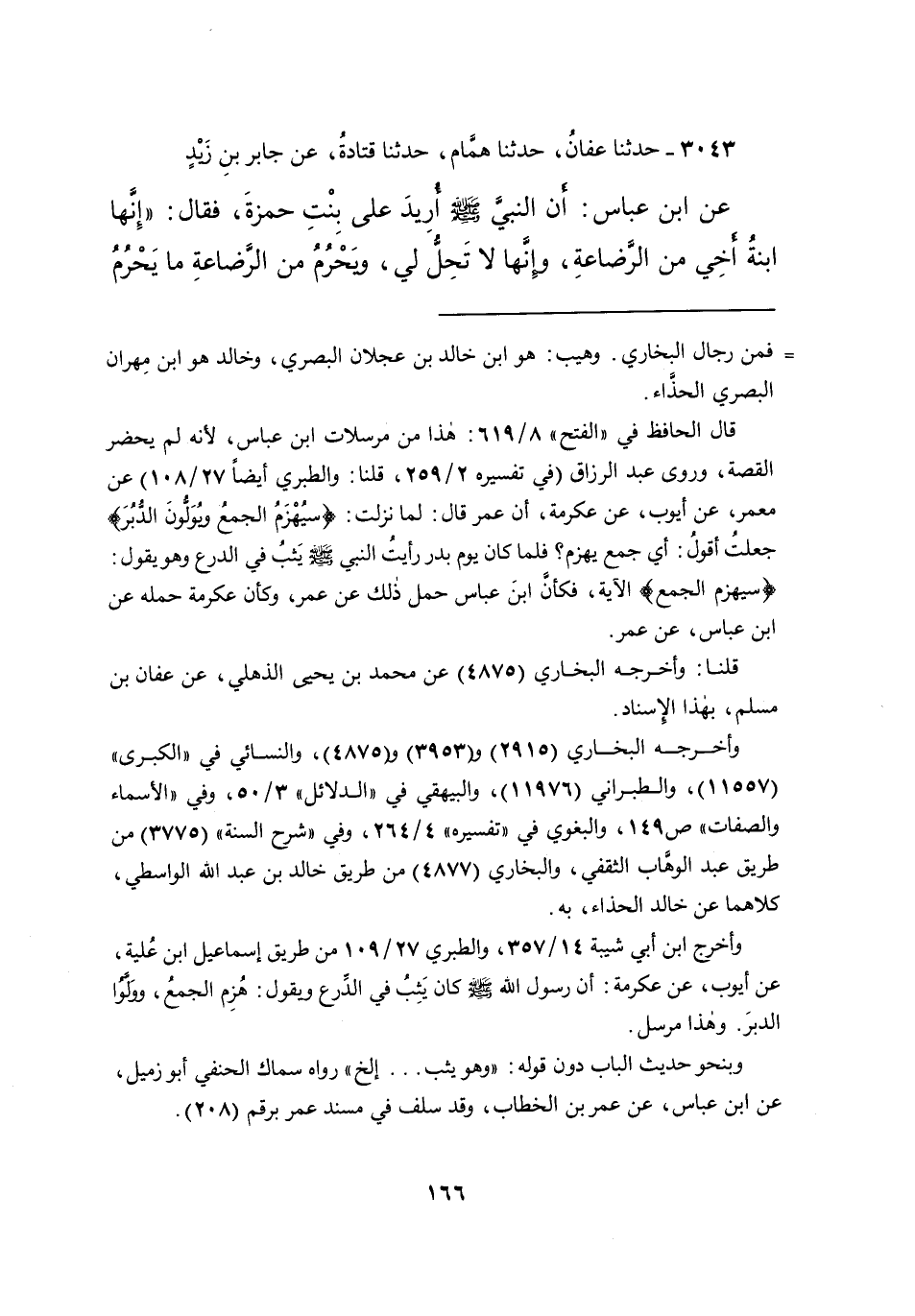 ٣٠٤٣ - حَدَّثَنَا عَفَّانُ، حَدَّثَنَا هَمَّامٌ، حَدَّثَنَا قَتَادَةُ، عَنْ جَابِرِ بْنِ زَيْدٍ، عَنِ ابْنِ عَبَّاسٍ: أَنَّ النَّبِيَّ صَلَّى اللهُ عَلَيْهِ وَسَلَّمَ أُرِيدَ عَلَى بِنْتِ حَمْزَةَ، فَقَالَ: " إِنَّهَا ابْنَةُ أَخِي مِنَ الرَّضَاعَةِ، وَإِنَّهَا لَا تَحِلُّ لِي، وَيَحْرُمُ مِنَ الرَّضَاعَةِ مَا يَحْرُمُ