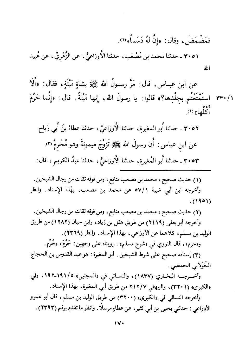 ٣٠٥٢ - حَدَّثَنَا أَبُو الْمُغِيرَةِ، حَدَّثَنَا الْأَوْزَاعِيُّ، حَدَّثَنَا عَطَاءُ بْنُ أَبِي رَبَاحٍ، عَنِ ابْنِ عَبَّاسٍ: أَنَّ رَسُولَ اللهِ صَلَّى اللهُ عَلَيْهِ وَسَلَّمَ " تَزَوَّجَ مَيْمُونَةَ وَهُوَ مُحْرِمٌ " (٣)