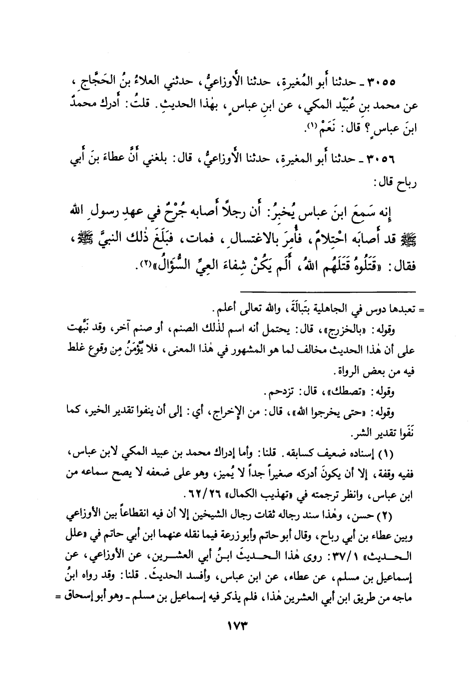٣٠٥٦ - حَدَّثَنَا أَبُو الْمُغِيرَةِ، حَدَّثَنَا الْأَوْزَاعِيُّ، قَالَ: بَلَغَنِي أَنَّ عَطَاءَ بْنَ أَبِي رَبَاحٍ، قَالَ: إِنَّهُ سَمِعَ ابْنَ عَبَّاسٍ، يُخْبِرُ: أَنَّ رَجُلًا أَصَابَهُ جُرْحٌ فِي عَهْدِ رَسُولِ اللهِ صَلَّى اللهُ عَلَيْهِ وَسَلَّمَ، ثُمَّ أَصَابَهُ احْتِلامٌ، فَأُمِرَ بِالاغْتِسَالِ، فَمَاتَ، فَبَلَغَ ذَلِكَ النَّبِيَّ صَلَّى اللهُ عَلَيْهِ وَسَلَّمَ، فَقَالَ: " قَتَلُوهُ قَتَلَهُمِ اللهُ، أَلَمْ يَكُنْ شِفَاءَ الْعِيِّ السُّؤَالُ " (٢)