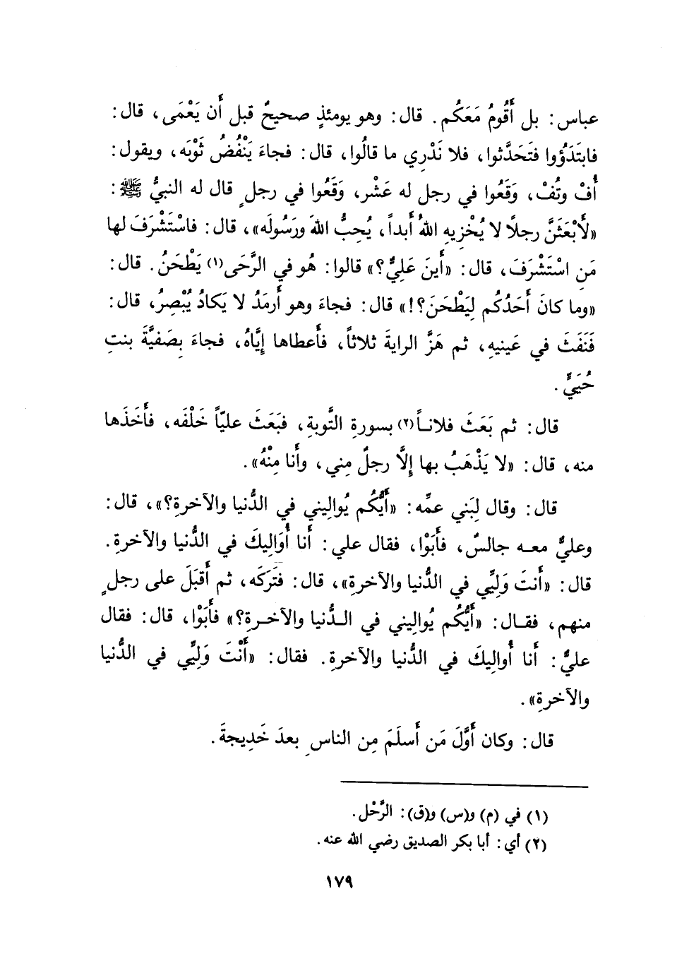 عَبَّاسٍ: بَلْ أقُومُ مَعَكُمْ، قَالَ: وَهُوَ يَوْمَئِذٍ صَحِيحٌ قَبْلَ أَنْ يَعْمَى، قَالَ: فَابْتَدَءُوا فَتَحَدَّثُوا، فَلَا نَدْرِي مَا قَالُوا، قَالَ: فَجَاءَ يَنْفُضُ ثَوْبَهُ، وَيَقُولُ: أُفْ وَتُفْ، وَقَعُوا فِي رَجُلٍ لَهُ عَشْرٌ، وَقَعُوا فِي رَجُلٍ قَالَ لَهُ النَّبِيُّ صَلَّى اللهُ عَلَيْهِ وَسَلَّمَ: " لَأَبْعَثَنَّ رَجُلًا لَا يُخْزِيهِ اللهُ أَبَدًا، يُحِبُّ اللهَ وَرَسُولَهُ "، قَالَ: فَاسْتَشْرَفَ لَهَا مَنِ اسْتَشْرَفَ، قَالَ: " أَيْنَ عَلِيٌّ؟ " قَالُوا: هُوَ فِي الرَّحَى (١) يَطْحَنُ، قَالَ: " وَمَا كَانَ أَحَدُكُمْ لِيَطْحَنَ؟ " قَالَ: فَجَاءَ وَهُوَ أَرْمَدُ لَا يَكَادُ يُبْصِرُ، قَالَ: فَنَفَثَ فِي عَيْنَيْهِ، ثُمَّ هَزَّ الرَّايَةَ ثَلَاثًا، فَأَعْطَاهَا إِيَّاهُ، فَجَاءَ بِصَفِيَّةَ بِنْتِ حُيَيٍّ. قَالَ: ثُمَّ بَعَثَ فُلَانًا (٢) بِسُورَةِ التَّوْبَةِ، فَبَعَثَ عَلِيًّا خَلْفَهُ، فَأَخَذَهَا مِنْهُ، قَالَ: " لَا يَذْهَبُ بِهَا إِلَّا رَجُلٌ مِنِّي، وَأَنَا مِنْهُ "، قَالَ: وَقَالَ لِبَنِي عَمِّهِ: " أَيُّكُمْ يُوَالِينِي فِي الدُّنْيَا وَالْآخِرَةِ؟ "، قَالَ: وَعَلِيٌّ مَعَهُ جَالِسٌ، فَأَبَوْا، فَقَالَ عَلِيٌّ: أَنَا أُوَالِيكَ فِي الدُّنْيَا وَالْآخِرَةِ، قَالَ: " أَنْتَ وَلِيِّي فِي الدُّنْيَا وَالْآخِرَةِ "، قَالَ: فَتَرَكَهُ، ثُمَّ أَقْبَلَ عَلَى رَجُلٍ مِنْهُمْ، فَقَالَ: " أَيُّكُمْ يُوَالِينِي فِي الدُّنْيَا وَالْآخِرَةِ؟ " فَأَبَوْا، قَالَ: فَقَالَ عَلِيٌّ: أَنَا أُوَالِيكَ فِي الدُّنْيَا وَالْآخِرَةِ. فَقَالَ: " أَنْتَ وَلِيِّي فِي الدُّنْيَا وَالْآخِرَةِ ". قَالَ: وَكَانَ أَوَّلَ مَنْ أَسْلَمَ مِنَ النَّاسِ بَعْدَ خَدِيجَةَ.