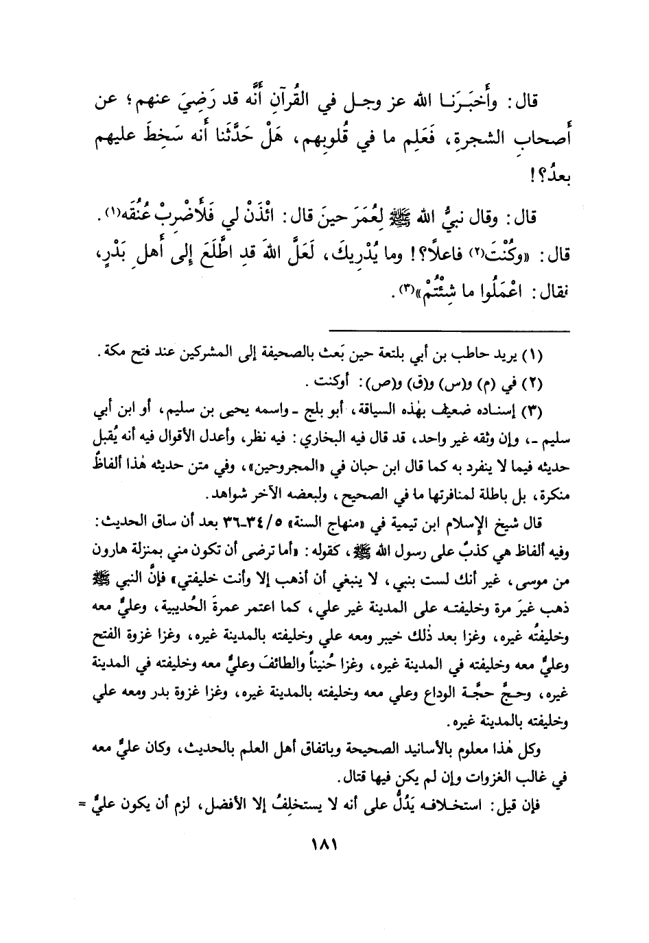 قال شيخ الاسلام ابن تيمية في "منهاج السنة" ٥/٣٤-٣٦ بعد أن ساق الحديث: وفيه ألفاظ هي كذب على رسول الله صَلَّى اللهُ عَلَيْهِ وَسَلَّمَ، كقوله: "أما ترضى أن تكون مني بمنزلة هارون من موسى، غير أنك لست بنبي، لا ينبغي أن أذهب إلا وأنت خليفتي" فإن النبي صَلَّى اللهُ عَلَيْهِ وَسَلَّمَ ذهب غيرَ مرة وخليفته على المدينة غير علي، كما اعتمر عمرةَ الحُديبية، وعلى معه وخليفتُه غيره، وغزا بعد ذلك خيبر ومعه علي وخليفته بالمدينة غيره، وغزا غزوة الفتح وعلي معه وخليفته في المدينة غيره، وغزا حُنيناً والطائفَ وعلي معه وخليفته في المدينة غيره، وحج حجة الوداع وعلي معه وخليفته بالمدينة غيره، وغزا غزوة بدر ومعه علي وخليفته بالمدينة غيره.