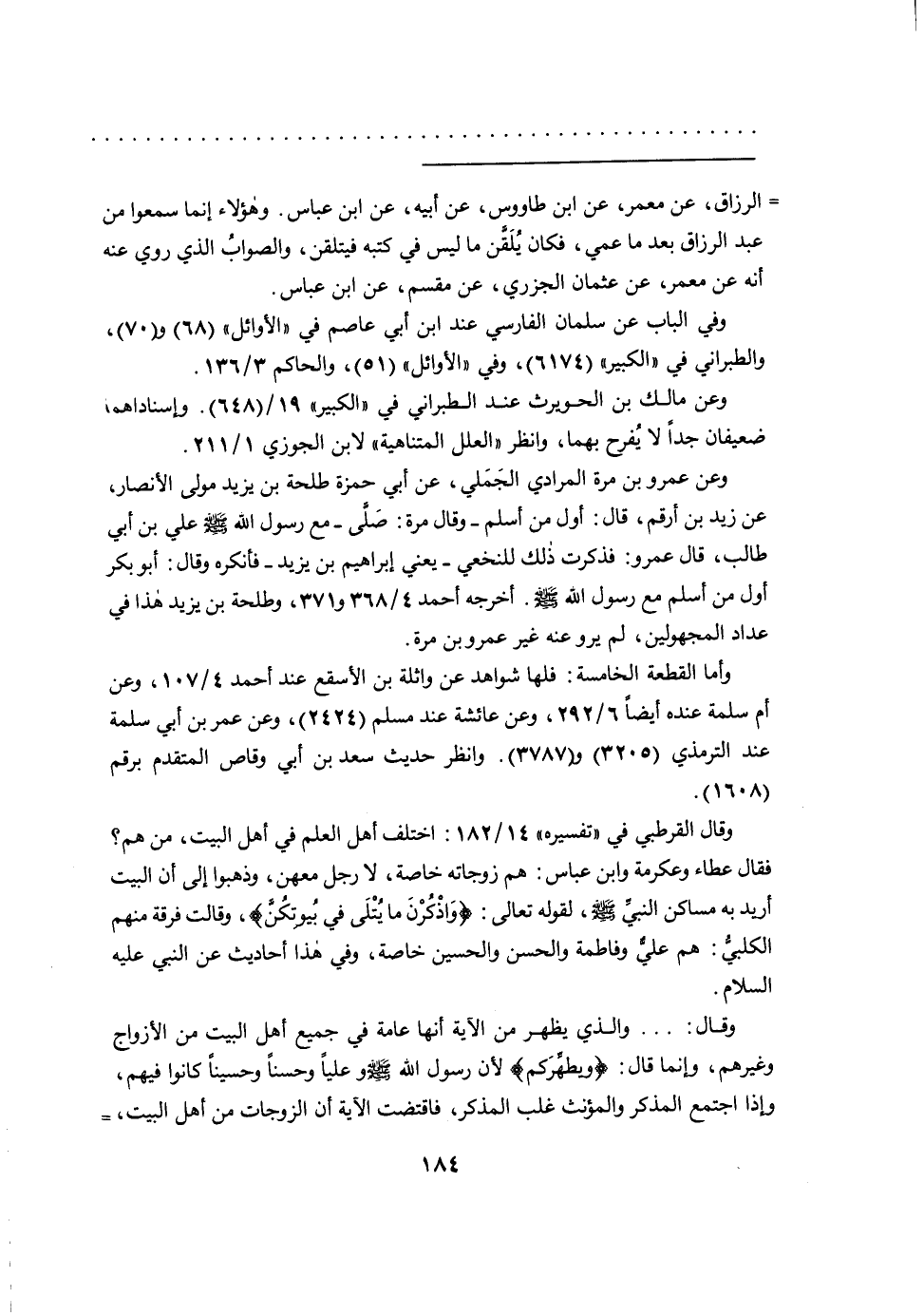 وقال القرطبي في "تفسيره" ١٤/١٨٢: اختلف أهل العلم في أهل البيت، من هم؟ فقال عطاء وعكرمة وابن عباس: هم زوجاته خاصة، لا رجل معهن، وذهبوا إلي أن البيت أريد به مساكن النبيَ صَلَّى اللهُ عَلَيْهِ وَسَلَّمَ، لقوله تعالي: (وَاذْكًرْنَ ما يُتْلَى في بيوتكُن) ، وقالت فرقة منهم الكلبي: هم علي وفاطمة والحسن والحسين خاصة، وفي هذا أحاديث عن النبي عليه السلام.