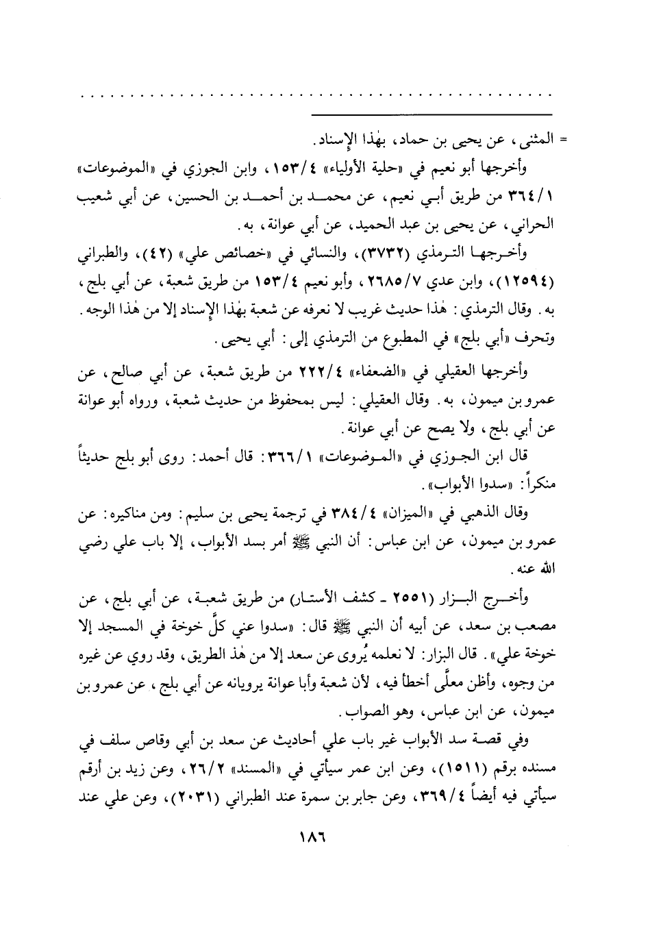 وقال الذهبي في "الميزان" ٤/٣٨٤ في ترجمة يحمى بن سليم: ومن مناكيره: عن عمرو بن ميمون، عن ابن عباس: أن النبي صَلَّى اللهُ عَلَيْهِ وَسَلَّمَ أمر بسد الأبواب، إلا باب علي رضي الله عنه.