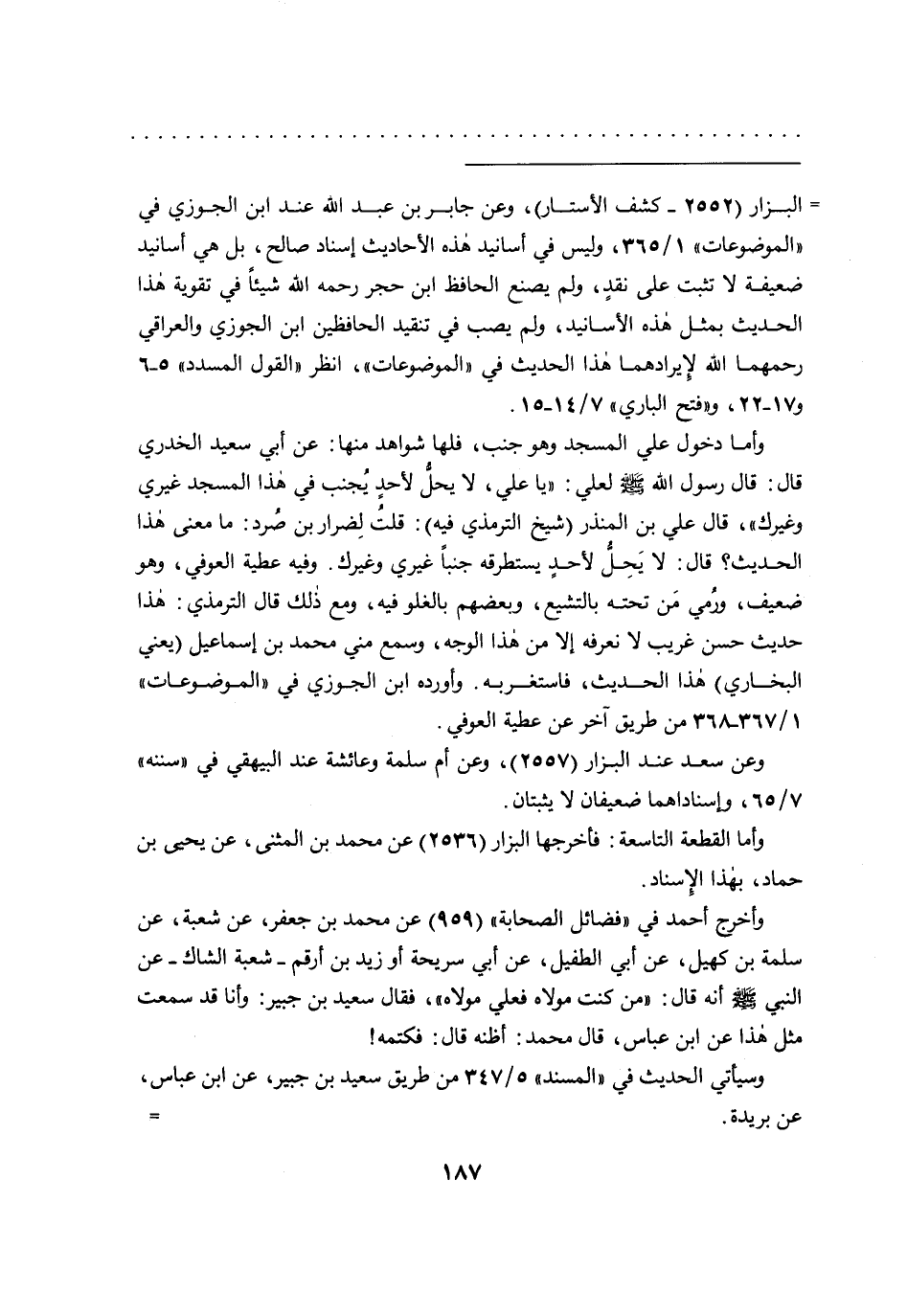 وأما دخول علي المسجد وهو جنب، فلها شواهد منها: عن أبي سعيد الخدري قال: قال رسول الله صَلَّى اللهُ عَلَيْهِ وَسَلَّمَ لعلي: "يا علي، لا يحل لأحدٍ يُجنب في هذا المسجد غيري وغيرك"، قال علي بن المنذر (شيخ الترمذي فيه) : قلتُ لِضرار بن صُرد: ما معنى هذا الحديث؟ قال: لا يَحِل لأحدٍ يستطرقه جنباً غيري وغيرك. وفيه عطية العوفي، وهو ضعيف، ورُمي مَن تحته بالتشيع، وبعضهم بالغلو فيه، ومع ذلك قال الترمذي: هذا حديث حسن غريب لا نعرفه إلا من هذا الوجه، وسمع مني محمد بن إسماعيل (يعني البخاري) هذا الحديث، فاستغربه. وأورده ابن الجوزي في "الموضوعات" ١/٣٦٧-٣٦٨ من طريق آخر عن عطية العوفي.