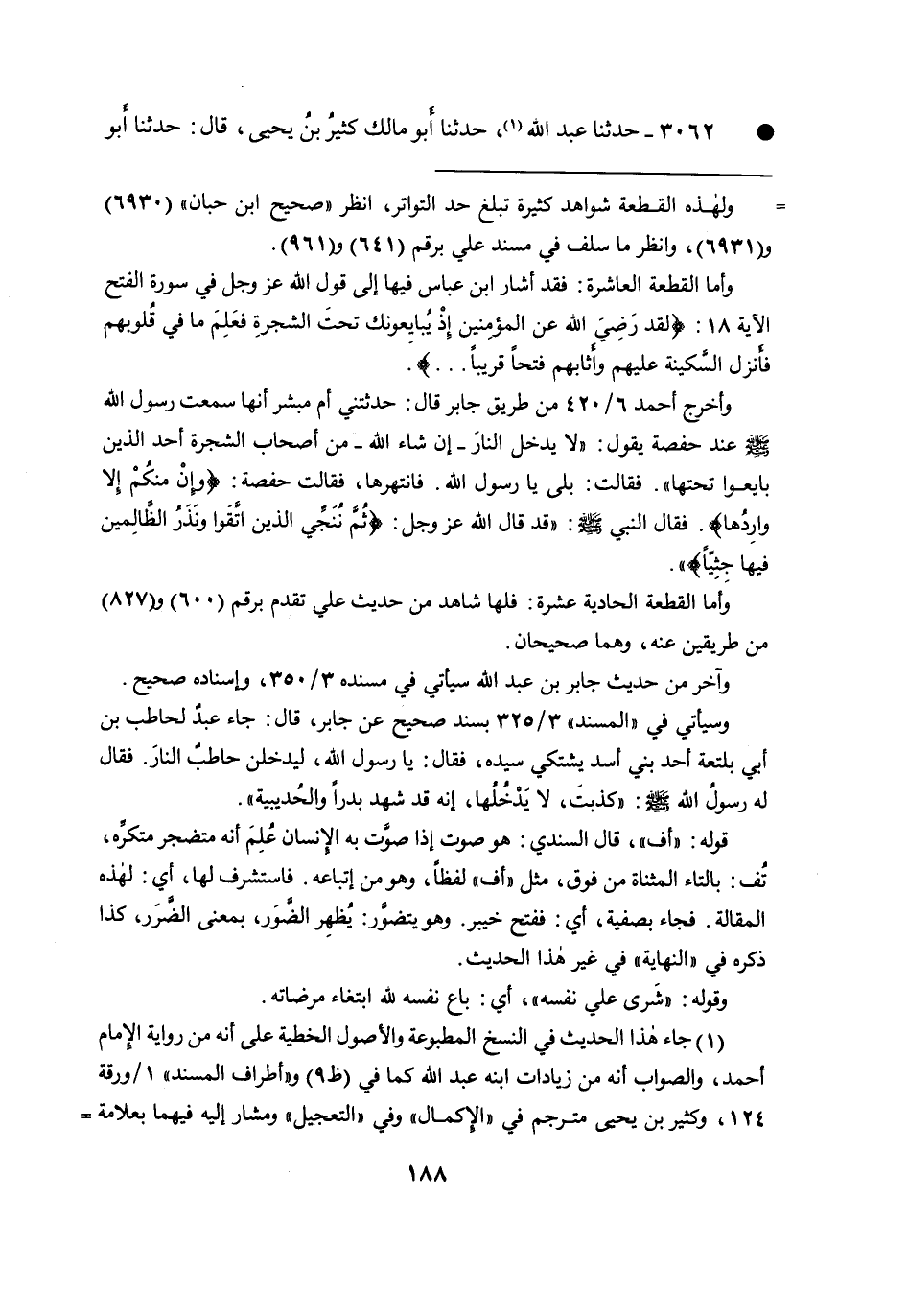 وأخرج أحمد ٦/٤٢٠ من طريق جابر قال: حدثتني أم مبشر أنها سمعت رسول الله صَلَّى اللهُ عَلَيْهِ وَسَلَّمَ عند حفصة يقول: "لا يدخل النارَ- إن شاء الله- من أصحاب الشجرة أحد الذين بايعوا تحتها". فقالت: بلى يا رسول الله. فانتهرها، فقالت حفصة: (وإن منكُمْ إلا وارِدُها) . فقال النبي صَلَّى اللهُ عَلَيْهِ وَسَلَّمَ: "قد قال الله عز وجل: (ثُم نُنَخي الذين اتقَوا ونَذَرُ الظالمين فيها جثِياً) ".