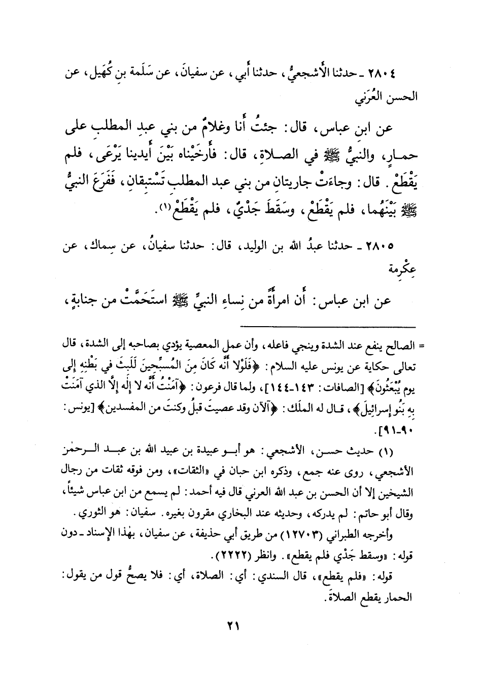 ٢٨٠٤ - حَدَّثَنَا الْأَشْجَعِيُّ، حَدَّثَنَا أَبِي، عَنْ سُفْيَانَ، عَنْ سَلَمَةَ بْنِ كُهَيْلٍ، عَنِ الْحَسَنِ الْعُرَنِيِّ، عَنِ ابْنِ عَبَّاسٍ، قَالَ: جِئْتُ أَنَا وَغُلامٌ مِنْ بَنِي عَبْدِ الْمُطَّلِبِ عَلَى حِمَارٍ، وَالنَّبِيُّ صَلَّى اللهُ عَلَيْهِ وَسَلَّمَ فِي الصَّلاةِ، قَالَ: فَأَرْخَيْنَاهُ بَيْنَ أَيْدِينَا يَرْعَى " فَلَمْ يَقْطَعْ ". قَالَ: وَجَاءَتْ جَارِيَتَانِ مِنْ بَنِي عَبْدِ الْمُطَّلِبِ تَسْتَبِقَانِ " فَفَرَعَ النَّبِيُّ صَلَّى اللهُ عَلَيْهِ وَسَلَّمَ بَيْنَهُمَا، فَلَمْ يَقْطَعْ، وَسَقَطَ جَدْيٌ، فَلَمْ يَقْطَعْ " (١)