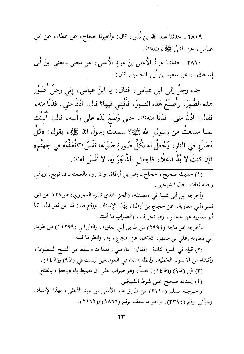 ٢٨١٠ - حَدَّثَنَا عَبْدُ الْأَعْلَى بْنُ عَبْدِ الْأَعْلَى، عَنْ يَحْيَى يَعْنِي ابْنَ أَبِي إِسْحَاقَ، عَنْ سَعِيدِ بْنِ أَبِي الْحَسَنِ، قَالَ: جَاءَ رَجُلٌ إِلَى ابْنِ عَبَّاسٍ، فَقَالَ: يَا أَبَا الْعَبَّاسِ، إِنِّي رَجُلٌ أُصَوِّرُ هَذِهِ الصُّوَرَ، وَأَصْنَعُ هَذِهِ الصُّوَرَ، فَأَفْتِنِي فِيهَا؟ قَالَ: ادْنُ مِنِّي، فَدَنَا مِنْهُ (٢) ، فقَالَ: ادْنُ مِنِّي، فَدَنَا مِنْهُ حَتَّى وَضَعَ يَدَهُ عَلَى رَأْسِهِ، قَالَ: أُنَبِّئُكَ بِمَا سَمِعْتُ مِنْ رَسُولِ اللهِ صَلَّى اللهُ عَلَيْهِ وَسَلَّمَ، سَمِعْتُ رَسُولَ اللهِ صَلَّى اللهُ عَلَيْهِ وَسَلَّمَ يَقُولُ: " كُلُّ مُصَوِّرٍ فِي النَّارِ، يُجْعَلُ لَهُ بِكُلِّ صُورَةٍ صَوَّرَهَا نَفْسٌ (٣) تُعَذِّبُهُ فِي جَهَنَّمَ " فَإِنْ كُنْتَ لَا بُدَّ فَاعِلًا، فَاجْعَلِ الشَّجَرَ وَمَا لَا نَفْسَ لَهُ (٤) .