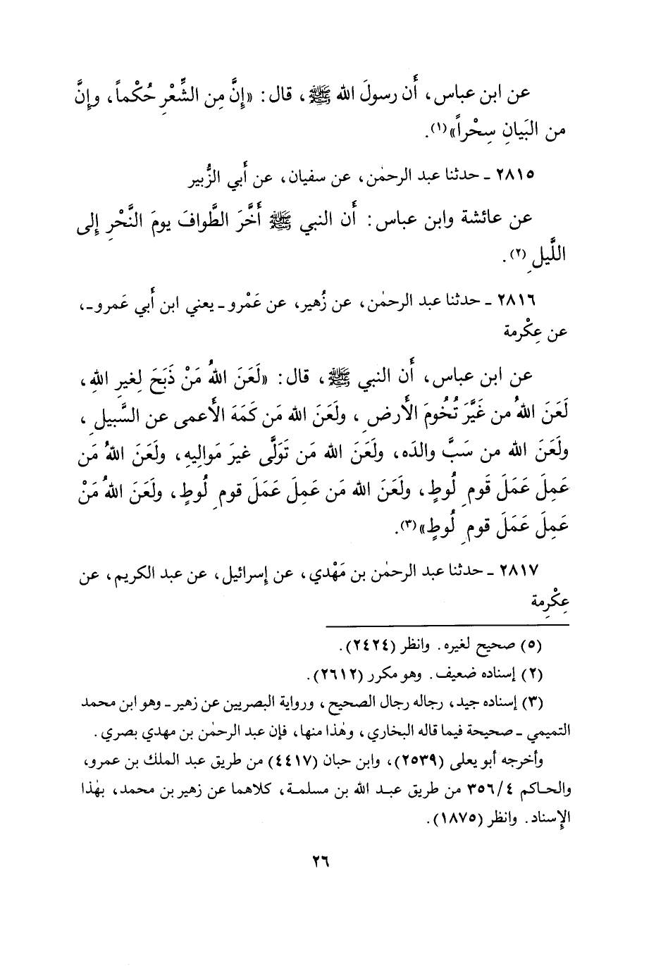 ٢٨١٦ - حَدَّثَنَا عَبْدُ الرَّحْمَنِ، عَنْ زُهَيْرٍ، عَنْ عَمْرٍو يَعْنِي ابْنَ أَبِي عَمْرٍو، عَنْ عِكْرِمَةَ، عَنِ ابْنِ عَبَّاسٍ، أَنَّ النَّبِيَّ صَلَّى اللهُ عَلَيْهِ وَسَلَّمَ، قَالَ: " لَعَنَ اللهُ مَنْ ذَبَحَ لِغَيْرِ اللهِ، لَعَنَ اللهُ مَنْ غَيَّرَ تُخُومَ الْأَرْضِ، وَلَعَنَ اللهُ مَنْ كَمَهَ الْأَعْمَى عَنِ السَّبِيلِ، وَلَعَنَ اللهُ مَنْ سَبَّ وَالِدَهُ، وَلَعَنَ اللهُ مَنْ تَوَلَّى غَيْرَ مَوَالِيهِ، وَلَعَنَ اللهُ مَنْ عَمِلَ عَمَلَ قَوْمِ لُوطٍ، وَلَعَنَ اللهُ مَنْ عَمِلَ عَمَلَ قَوْمِ لُوطٍ، وَلَعَنَ اللهُ مَنْ عَمِلَ عَمَلَ قَوْمِ لُوطٍ " (٣)