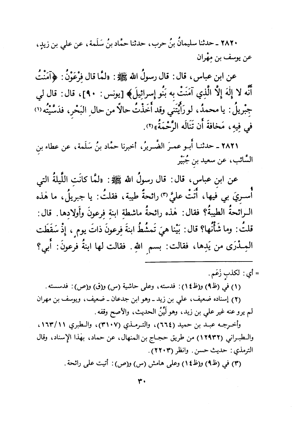 ٢٨٢١ - حَدَّثَنَا أَبُو عُمَرَ الضَّرِيرُ، أَخْبَرَنَا حَمَّادُ بْنُ سَلَمَةَ، عَنْ عَطَاءِ بْنِ السَّائِبِ، عَنْ سَعِيدِ بْنِ جُبَيْرٍ، عَنِ ابْنِ عَبَّاسٍ، قَالَ: قَالَ رَسُولُ اللهِ صَلَّى اللهُ عَلَيْهِ وَسَلَّمَ: " لَمَّا كَانَتِ اللَّيْلَةُ الَّتِي أُسْرِيَ بِي فِيهَا، أَتَتْ عَلَيَّ (٣) رَائِحَةٌ طَيِّبَةٌ، فَقُلْتُ: يَا جِبْرِيلُ، مَا هَذِهِ الرَّائِحَةُ الطَّيِّبَةُ؟ فَقَالَ: هَذِهِ رَائِحَةُ مَاشِطَةِ ابْنَةِ فِرْعَوْنَ وَأَوْلادِهَا ". قَالَ: " قُلْتُ: وَمَا شَأْنُهَا؟ قَالَ: بَيْنَا هِيَ تُمَشِّطُ ابْنَةَ فِرْعَوْنَ ذَاتَ يَوْمٍ، إِذْ سَقَطَتِ الْمِدْرَى مِنْ يَدَيْهَا، فَقَالَتْ: بِسْمِ اللهِ. فَقَالَتْ لَهَا ابْنَةُ فِرْعَوْنَ: أَبِي؟