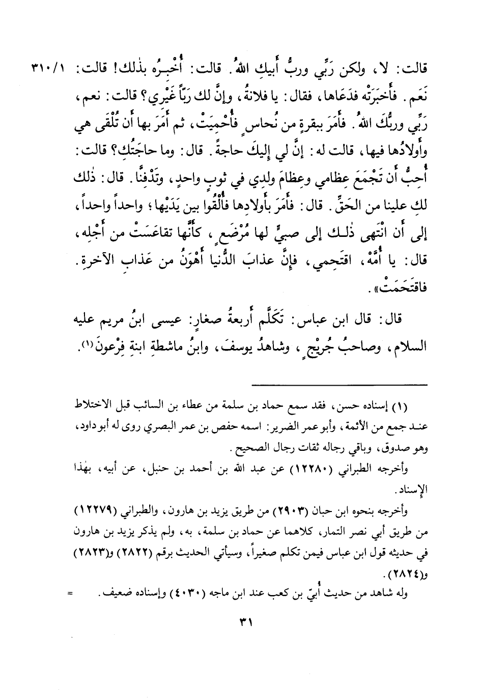 قَالَتْ: لَا، وَلَكِنْ رَبِّي وَرَبُّ أَبِيكِ اللهُ. قَالَتْ: أُخْبِرُهُ بِذَلِكَ قَالَتْ: نَعَمْ. فَأَخْبَرَتْهُ فَدَعَاهَا، فَقَالَ: يَا فُلانَةُ، وَإِنَّ لَكِ رَبًّا غَيْرِي؟ قَالَتْ: نَعَمْ، رَبِّي وَرَبُّكَ اللهُ. فَأَمَرَ بِبَقَرَةٍ مِنْ نُحَاسٍ فَأُحْمِيَتْ، ثُمَّ أَمَرَ بِهَا أَنْ تُلْقَى هِيَ وَأَوْلادُهَا فِيهَا، قَالَتْ لَهُ: إِنَّ لِي إِلَيْكَ حَاجَةً. قَالَ: وَمَا حَاجَتُكِ؟ قَالَتْ: أُحِبُّ أَنْ تَجْمَعَ عِظَامِي وَعِظَامَ وَلَدِي فِي ثَوْبٍ وَاحِدٍ، وَتَدْفِنَنَا. قَالَ: ذَلِكَ لَكِ عَلَيْنَا مِنَ الحَقِّ ". قَالَ: " فَأَمَرَ بِأَوْلادِهَا فَأُلْقُوا بَيْنَ يَدَيْهَا، وَاحِدًا وَاحِدًا، إِلَى أَنِ انْتَهَى ذَلِكَ إِلَى صَبِيٍّ لَهَا مُرْضَعٍ، كَأَنَّهَا تَقَاعَسَتْ مِنْ أَجْلِهِ، قَالَ: يَا أُمَّهْ، اقْتَحِمِي، فَإِنَّ عَذَابَ الدُّنْيَا أَهْوَنُ مِنْ عَذَابِ الْآخِرَةِ، فَاقْتَحَمَتْ " قَالَ: قَالَ ابْنُ عَبَّاسٍ: " تَكَلَّمَ أَرْبَعَةٌ صِغَارٌ: عِيسَى ابْنُ مَرْيَمَ عَلَيْهِ السَّلامُ، وَصَاحِبُ جُرَيْجٍ، وَشَاهِدُ يُوسُفَ، وَابْنُ مَاشِطَةِ ابْنَةِ فِرْعَوْنَ " (١)