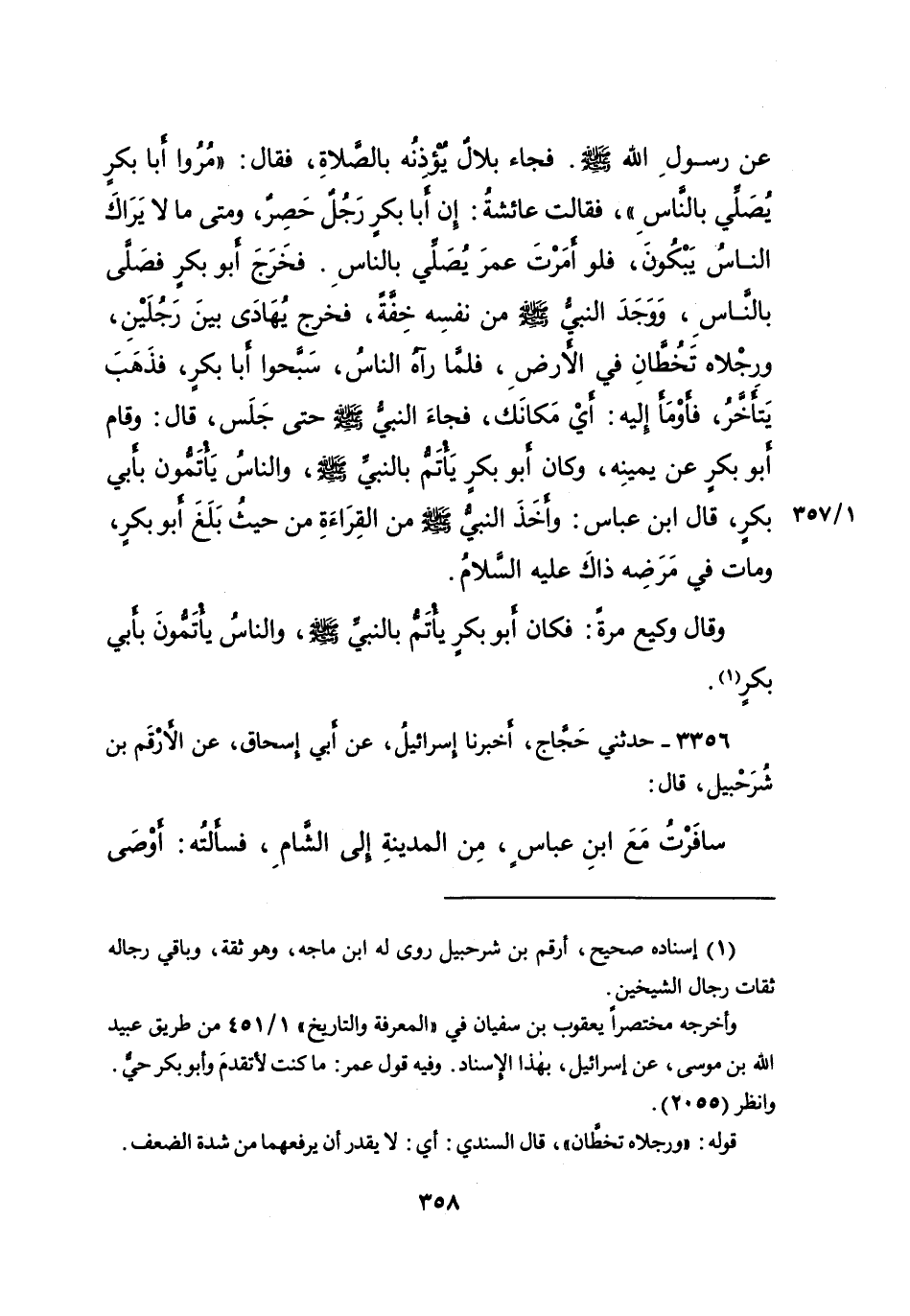 عَنْ رَسُولِ اللهِ صَلَّى اللهُ عَلَيْهِ وَسَلَّمَ فَجَاءَ بِلَالٌ يُؤْذِنُهُ بِالصَّلَاةِ، فَقَالَ: " مُرُوا أَبَا بَكْرٍ يُصَلِّي بِالنَّاسِ "، فَقَالَتْ عَائِشَةُ: إِنَّ أَبَا بَكْرٍ رَجُلٌ حَصِرٌ، وَمَتَى مَا لَا يَرَاكَ النَّاسُ يَبْكُونَ، فَلَوْ أَمَرْتَ عُمَرَ يُصَلِّي بِالنَّاسِ، فَخَرَجَ أَبُو بَكْرٍ فَصَلَّى بِالنَّاسِ. وَوَجَدَ النَّبِيُّ صَلَّى اللهُ عَلَيْهِ وَسَلَّمَ مِنْ نَفْسِهِ خِفَّةً، فَخَرَجَ يُهَادَى بَيْنَ رَجُلَيْنِ، وَرِجْلَاهُ تَخُطَّانِ فِي الْأَرْضِ، فَلَمَّا رَآهُ النَّاسُ، سَبَّحُوا أَبَا بَكْرٍ، فَذَهَبَ يَتَأَخَّرُ، فَأَوْمَأَ إِلَيْهِ: أَيْ مَكَانَكَ، فَجَاءَ النَّبِيُّ صَلَّى اللهُ عَلَيْهِ وَسَلَّمَ حَتَّى جَلَسَ، قَالَ: وَقَامَ أَبُو بَكْرٍ عَنْ يَمِينِهِ، وَكَانَ أَبُو بَكْرٍ يَأْتَمُّ بِالنَّبِيِّ صَلَّى اللهُ عَلَيْهِ وَسَلَّمَ، وَالنَّاسُ يَأْتَمُّونَ بِأَبِي بَكْرٍ، قَالَ ابْنُ عَبَّاسٍ: وَأَخَذَ النَّبِيُّ صَلَّى اللهُ عَلَيْهِ وَسَلَّمَ مِنَ الْقِرَاءَةِ مِنْ حَيْثُ بَلَغَ أَبُو بَكْرٍ، وَمَاتَ فِي مَرَضِهِ ذَاكَ عَلَيْهِ السَّلَامُ وَقَالَ وَكِيعٌ مَرَّةً: " فَكَانَ أَبُو بَكْرٍ يَأْتَمُّ بِالنَّبِيِّ صَلَّى اللهُ عَلَيْهِ وَسَلَّمَ، وَالنَّاسُ يَأْتَمُّونَ بِأَبِي بَكْرٍ " (١)