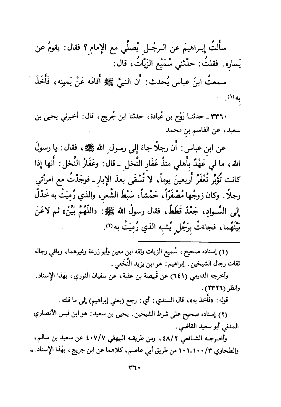 ٣٣٦٠ - حَدَّثَنَا رَوْحُ بْنُ عُبَادَةَ، حَدَّثَنَا ابْنُ جُرَيْجٍ، قَالَ: أَخْبَرَنِي يَحْيَى بْنُ سَعِيدٍ، عَنِ الْقَاسِمِ بْنِ مُحَمَّدٍ، عَنِ ابْنِ عَبَّاسٍ: أَنَّ رَجُلًا جَاءَ إِلَى رَسُولِ اللهِ صَلَّى اللهُ عَلَيْهِ وَسَلَّمَ، فَقَالَ: يَا رَسُولَ اللهِ، مَا لِي عَهْدٌ بِأَهْلِي مُنْذُ عَفَارِ النَّخْلِ - قَالَ: وَعَفَارُ النَّخْلِ: أَنَّهَا إِذَا كَانَتْ تُؤْبَرُ تُعْفَرُ أَرْبَعِينَ يَوْمًا، لَا تُسْقَى بَعْدَ الْإِبَارِ - فَوَجَدْتُ مَعَ امْرَأَتِي رَجُلًا، وَكَانَ زَوْجُهَا مُصْفَرًّا، حَمْشًا، سَبْطَ الشَّعْرِ، وَالَّذِي رُمِيَتْ بِهِ خَدْلٌ إِلَى السَّوَادِ، جَعْدٌ قَطَطٌ، فَقَالَ رَسُولُ اللهِ صَلَّى اللهُ عَلَيْهِ وَسَلَّمَ: " اللهُمَّ بَيِّنْ " ثُمَّ لَاعَنَ بَيْنَهُمَا، فَجَاءَتْ بِرَجُلٍ يُشْبِهُ الَّذِي رُمِيَتْ بِهِ (٢)