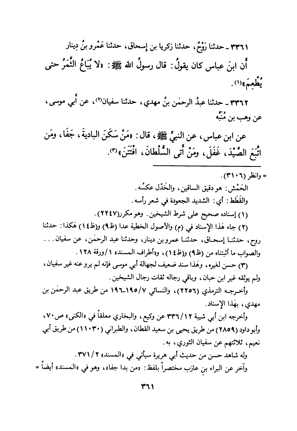 ٣٣٦٢ - حَدَّثَنَا عَبْدُ الرَّحْمَنِ بْنُ مَهْدِيٍّ، حَدَّثَنَا سُفْيَانُ (٢) ، عَنْ أَبِي مُوسَى، عَنْ وَهْبِ بْنِ مُنَبِّهٍ، عَنِ ابْنِ عَبَّاسٍ، عَنِ النَّبِيِّ صَلَّى اللهُ عَلَيْهِ وَسَلَّمَ قَالَ: " مَنْ سَكَنَ الْبَادِيَةَ، جَفَا، وَمَنِ اتَّبَعَ الصَّيْدَ، غَفَلَ، وَمَنْ أَتَى السُّلْطَانَ، افْتَتَنَ " (٣)