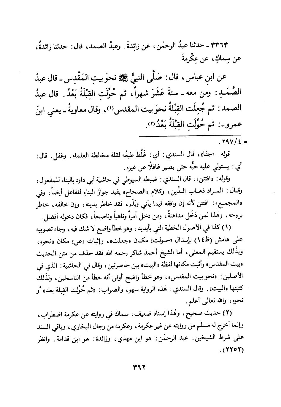 ٣٣٦٣ - حَدَّثَنَا عَبْدُ الرَّحْمَنِ، عَنْ زَائِدَةَ، وَعَبْدُ الصَّمَدِ، قَالَ: حَدَّثَنَا زَائِدَةُ، عَنْ سِمَاكٍ، عَنْ عِكْرِمَةَ، عَنِ ابْنِ عَبَّاسٍ، قَالَ: " صَلَّى النَّبِيُّ صَلَّى اللهُ عَلَيْهِ وَسَلَّمَ نَحْوَ بَيْتِ الْمَقْدِسِ - قَالَ عَبْدُ الصَّمَدِ: وَمَنْ مَعَهُ - سِتَّةَ عَشَرَ شَهْرًا، ثُمَّ حُوِّلَتِ الْقِبْلَةُ بَعْدُ، قَالَ عَبْدُ الصَّمَدِ: ثُمَّ جُعِلَتِ الْقِبْلَةُ نَحْوَ بَيْتِ الْمَقْدِسِ (١) وقَالَ مُعَاوِيَةُ يَعْنِي ابْنَ عَمْرٍو: ثُمَّ حُوِّلَتِ الْقِبْلَةُ بَعْدُ (٢)