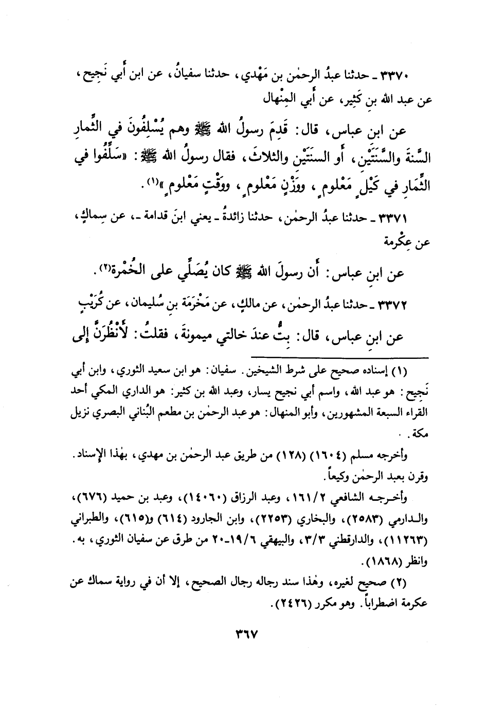 ٣٣٧٠ - حَدَّثَنَا عَبْدُ الرَّحْمَنِ بْنُ مَهْدِيٍّ، حَدَّثَنَا سُفْيَانُ، عَنِ ابْنِ أَبِي نَجِيحٍ، عَنْ عَبْدِ اللهِ بْنِ كَثِيرٍ، عَنْ أَبِي الْمِنْهَالِ، عَنِ ابْنِ عَبَّاسٍ، قَالَ: قَدِمَ رَسُولُ اللهِ صَلَّى اللهُ عَلَيْهِ وَسَلَّمَ وَهُمْ يُسْلِفُونَ فِي الثِّمَارِ السَّنَةَ وَالسَّنَتَيْنِ، أَوِ السَّنَتَيْنِ وَالثَّلَاثَ، فَقَالَ رَسُولُ اللهِ صَلَّى اللهُ عَلَيْهِ وَسَلَّمَ: " سَلِّفُوا فِي الثِّمَارِ فِي كَيْلٍ مَعْلُومٍ، وَوَزْنٍ مَعْلُومٍ، وَوَقْتٍ مَعْلُومٍ " (١)