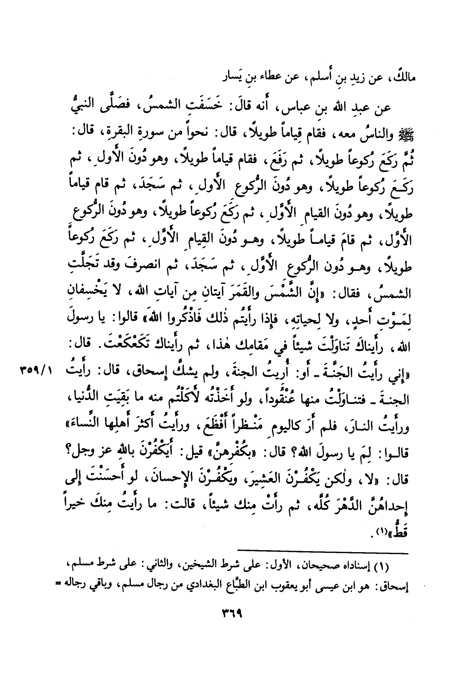 مَالِكٌ، عَنْ زَيْدِ بْنِ أَسْلَمَ، عَنْ عَطَاءِ بْنِ يَسَارٍ، عَنْ عَبْدِ اللهِ بْنِ عَبَّاسٍ، أَنَّهُ قَالَ: خَسَفَتِ الشَّمْسُ، فَصَلَّى النَّبِيُّ صَلَّى اللهُ عَلَيْهِ وَسَلَّمَ وَالنَّاسُ مَعَهُ، فَقَامَ قِيَامًا طَوِيلًا، قَالَ: نَحْوًا مِنْ سُورَةِ الْبَقَرَةِ، قَالَ: ثُمَّ رَكَعَ رُكُوعًا طَوِيلًا، ثُمَّ رَفَعَ، فَقَامَ قِيَامًا طَوِيلًا، وَهُوَ دُونَ الْأَوَّلِ، ثُمَّ رَكَعَ رُكُوعًا طَوِيلًا، وَهُوَ دُونَ الرُّكُوعِ الْأَوَّلِ، ثُمَّ سَجَدَ، ثُمَّ قَامَ قِيَامًا طَوِيلًا، وَهُوَ دُونَ الْقِيَامِ الْأَوَّلِ، ثُمَّ رَكَعَ رُكُوعًا طَوِيلًا، وَهُوَ دُونَ الرُّكُوعِ الْأَوَّلِ، ثُمَّ قَامَ قِيَامًا طَوِيلًا، وَهُوَ دُونَ الْقِيَامِ الْأَوَّلِ، ثُمَّ رَكَعَ رُكُوعًا طَوِيلًا، وَهُوَ دُونَ الرُّكُوعِ الْأَوَّلِ، ثُمَّ سَجَدَ، ثُمَّ انْصَرَفَ، وَقَدْ تَجَلَّتِ الشَّمْسُ، فَقَالَ: " إِنَّ الشَّمْسَ وَالْقَمَرَ آيَتَانِ مِنْ آيَاتِ اللهِ، لَا يَخْسِفَانِ لِمَوْتِ أَحَدٍ، وَلَا لِحَيَاتِهِ، فَإِذَا رَأَيْتُمْ ذَلِكَ فَاذْكُرُوا اللهَ " قَالُوا: يَا رَسُولَ اللهِ، رَأَيْنَاكَ تَنَاوَلْتَ شَيْئًا فِي مَقَامِكَ هَذَا، ثُمَّ رَأَيْنَاكَ تَكَعْكَعْتَ، قَالَ: " إِنِّي رَأَيْتُ الْجَنَّةَ - أَوْ أُرِيتُ الْجَنَّةَ، وَلَمْ يَشُكَّ إِسْحَاقُ، قَالَ: رَأَيْتُ الْجَنَّةَ - فَتَنَاوَلْتُ مِنْهَا عُنْقُودًا، وَلَوْ أَخَذْتُهُ لَأَكَلْتُمْ مِنْهُ مَا بَقِيَتِ الدُّنْيَا، وَرَأَيْتُ النَّارَ، فَلَمْ أَرَ كَالْيَوْمِ مَنْظَرًا أَفْظَعَ، وَرَأَيْتُ أَكْثَرَ أَهْلِهَا النِّسَاءَ " قَالُوا: لِمَ يَا رَسُولَ اللهِ؟ قَالَ: " بِكُفْرِهِنَّ " قَالَ: أَيَكْفُرْنَ بِاللهِ عَزَّ وَجَلَّ؟ قَالَ: " لَا، وَلَكِنْ يَكْفُرْنَ الْعَشِيرَ، وَيَكْفُرْنَ الْإِحْسَانَ، لَوْ أَحْسَنْتَ إِلَى إِحْدَاهُنَّ الدَّهْرَ كُلَّهُ، ثُمَّ رَأَتْ مِنْكَ شَيْئًا، قَالَتْ: مَا رَأَيْتُ مِنْكَ خَيْرًا قَطُّ " (١)