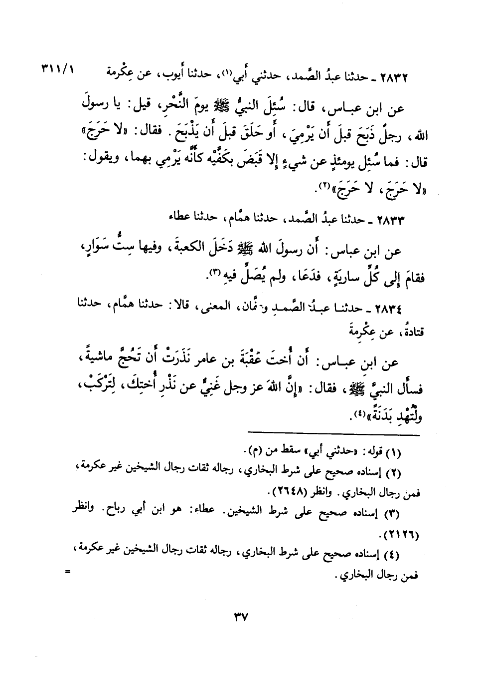 ٢٨٣٢ - حَدَّثَنَا عَبْدُ الصَّمَدِ، حَدَّثَنِي أَبِي (١) ، حَدَّثَنِي أَيُّوبُ، عَنْ عِكْرِمَةَ، عَنِ ابْنِ عَبَّاسٍ، قَالَ: سُئِلَ النَّبِيُّ صَلَّى اللهُ عَلَيْهِ وَسَلَّمَ يَوْمَ النَّحْرِ، قِيلَ: يَا رَسُولَ اللهِ، رَجُلٌ ذَبَحَ قَبْلَ أَنْ يَرْمِيَ، أَوْ حَلَقَ قَبْلَ أَنْ يَذْبَحَ. فَقَالَ: " لَا حَرَجَ " قَالَ: فَمَا سُئِلَ يَوْمَئِذٍ عَنْ شَيْءٍ إِلا قَبَضَ بِكَفَّيْهِ كَأَنَّهُ يَرْمِي بِهِمَا، وَيَقُولُ: " لَا حَرَجَ، لَا حَرَجَ " (٢)
