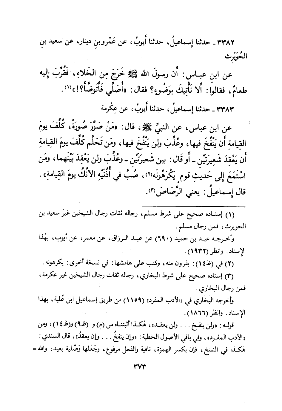 ٣٣٨٣ - حَدَّثَنَا إِسْمَاعِيلُ، حَدَّثَنَا أَيُّوبُ، عَنْ عِكْرِمَةَ، عَنِ ابْنِ عَبَّاسٍ، عَنِ النَّبِيِّ صَلَّى اللهُ عَلَيْهِ وَسَلَّمَ قَالَ: " مَنْ صَوَّرَ صُورَةً، كُلِّفَ يَوْمَ الْقِيَامَةِ أَنْ يَنْفُخَ فِيهَا، وَعُذِّبَ وَلَنْ يَنْفُخَ فِيهَا، وَمَنْ تَحَلَّمَ كُلِّفَ يَوْمَ الْقِيَامَةِ أَنْ يَعْقِدَ شَعِيرَتَيْنِ - أَوْ قَالَ: بَيْنَ شَعِيرَتَيْنِ -، وَعُذِّبَ وَلَنْ يَعْقِدَ بَيْنَهُمَا، وَمَنِ اسْتَمَعَ إِلَى حَدِيثِ قَوْمٍ يَكْرَهُونَهُ (٢) ، صُبَّ فِي أُذُنَيْهِ الْآنُكُ يَوْمَ الْقِيَامَةِ " قَالَ إِسْمَاعِيلُ: " يَعْنِي الرَّصَاصَ " (٣)