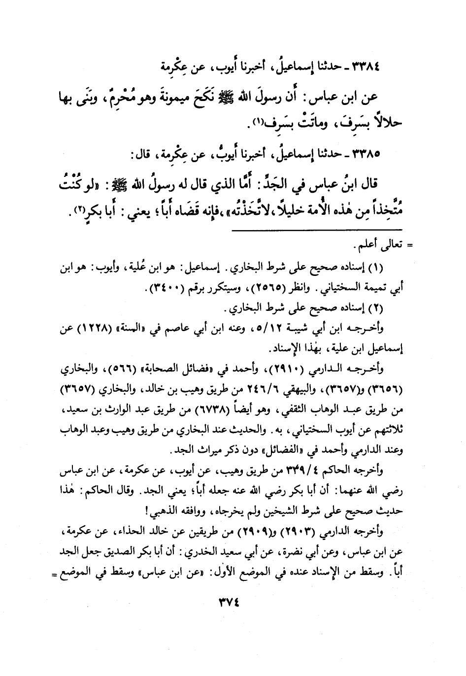 ٣٣٨٤ - حَدَّثَنَا إِسْمَاعِيلُ، أَخْبَرَنَا أَيُّوبُ، عَنْ عِكْرِمَةَ، عَنِ ابْنِ عَبَّاسٍ: " أَنَّ رَسُولَ اللهِ صَلَّى اللهُ عَلَيْهِ وَسَلَّمَ نَكَحَ مَيْمُونَةَ، وَهُوَ مُحْرِمٌ وَبَنَى بِهَا حَلَالًا بِسَرِفَ، وَمَاتَتْ بِسَرِفَ (١) "