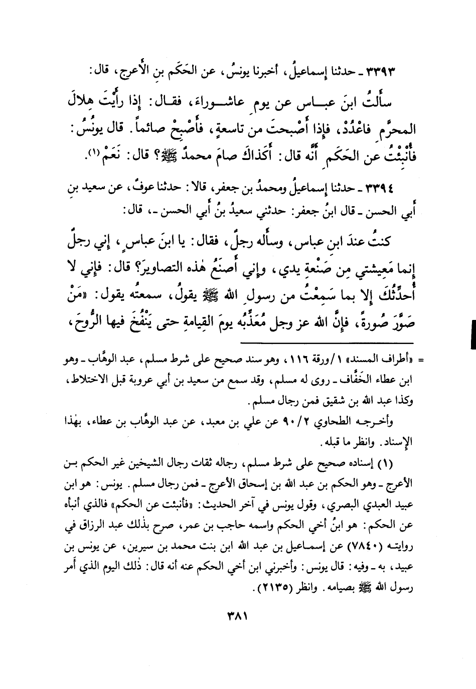 ٣٣٩٣ - حَدَّثَنَا إِسْمَاعِيلُ، أَخْبَرَنَا يُونُسُ، عَنِ الْحَكَمِ بْنِ الْأَعْرَجِ، قَالَ: سَأَلْتُ ابْنَ عَبَّاسٍ عَنْ يَوْمِ عَاشُورَاءَ فَقَالَ: " إِذَا رَأَيْتَ هِلَالَ الْمُحَرَّمِ فَاعْدُدْ، فَإِذَا أَصْبَحْتَ مِنْ تَاسِعَةٍ، فَأَصْبِحْ صَائِمًا " قَالَ يُونُسُ، فَأُنْبِئْتُ عَنِ الْحَكَمِ أَنَّهُ قَالَ: أَكَذَاكَ صَامَ مُحَمَّدٌ صَلَّى اللهُ عَلَيْهِ وَسَلَّمَ؟ قَالَ: نَعَمْ (١)