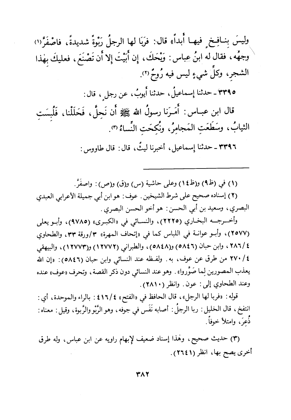 ٣٣٩٥ - حَدَّثَنَا إِسْمَاعِيلُ، حَدَّثَنَا أَيُّوبُ، عَنْ رَجُلٍ، قَالَ: قَالَ ابْنُ عَبَّاسٍ: " أَمَرَنَا رَسُولُ اللهِ صَلَّى اللهُ عَلَيْهِ وَسَلَّمَ أَنْ نَحِلَّ، فَحَلَلْنَا، فَلُبِسَتِ الثِّيَابُ، وَسَطَعَتِ الْمَجَامِرُ، وَنُكِحَتِ النِّسَاءُ " (٣)