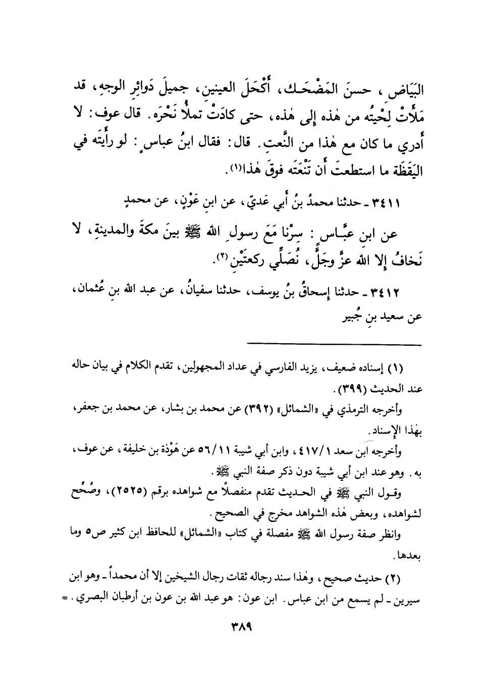 ٣٤١١ - حَدَّثَنَا مُحَمَّدُ بْنُ أَبِي عَدِيٍّ، عَنِ ابْنِ عَوْنٍ، عَنْ مُحَمَّدٍ، عَنِ ابْنِ عَبَّاسٍ، " سِرْنَا مَعَ رَسُولِ اللهِ صَلَّى اللهُ عَلَيْهِ وَسَلَّمَ بَيْنَ مَكَّةَ وَالْمَدِينَةِ، لَا نَخَافُ إِلَّا اللهَ عَزَّ وَجَلَّ نُصَلِّي رَكْعَتَيْنِ " (٢)