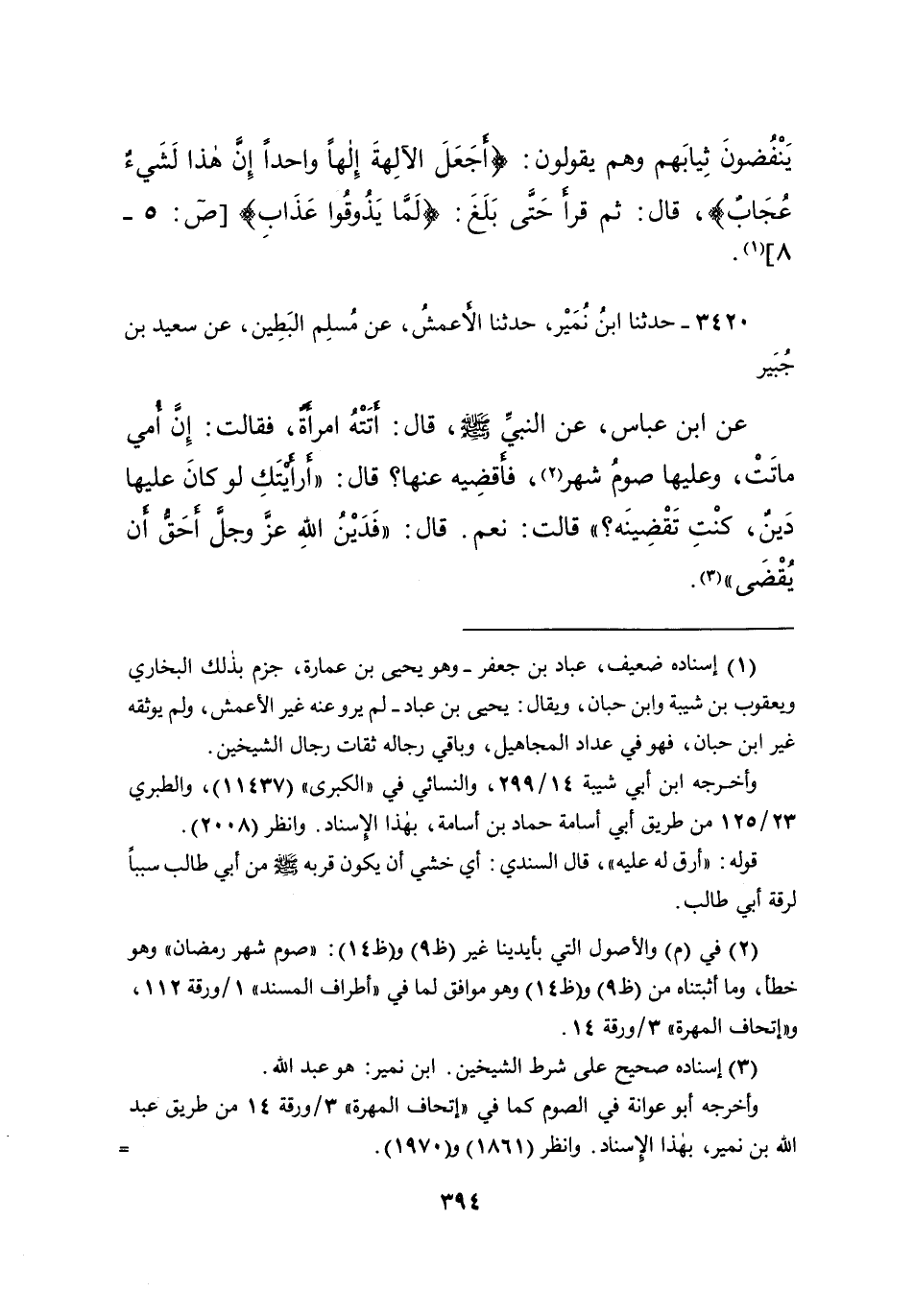 ٣٤٢٠ - حَدَّثَنَا ابْنُ نُمَيْرٍ، حَدَّثَنَا الْأَعْمَشُ، عَنْ مُسْلِمٍ الْبَطِينِ، عَنْ سَعِيدِ بْنِ جُبَيْرٍ، عَنِ ابْنِ عَبَّاسٍ، عَنِ النَّبِيِّ صَلَّى اللهُ عَلَيْهِ وَسَلَّمَ قَالَ: أَتَتْهُ امْرَأَةٌ فَقَالَتْ: إِنَّ أُمِّي مَاتَتْ وَعَلَيْهَا صَوْمُ شَهْرٍ (٢) فَأَقْضِيهِ عَنْهَا قَالَ: " أَرَأَيْتَكِ لَوْ كَانَ عَلَيْهَا دَيْنٌ، كُنْتِ تَقْضِينَهُ؟ " قَالَتْ: نَعَمْ قَالَ: " فَدَيْنُ اللهِ عَزَّ وَجَلَّ أَحَقُّ أَنْ يُقْضَى " (٣)