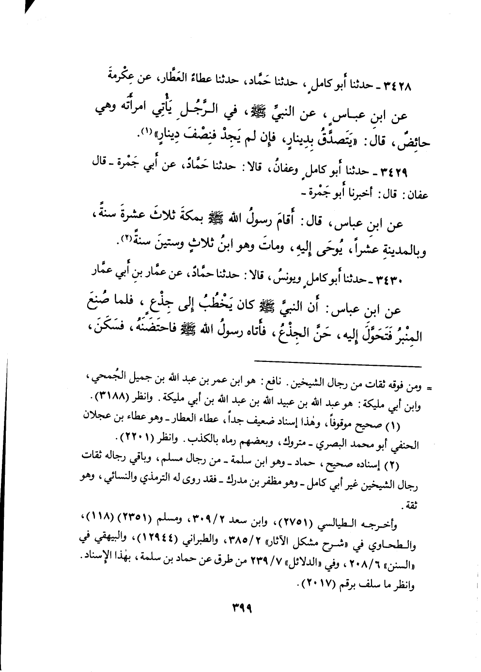 ٣٤٢٨ - حَدَّثَنَا أَبُو كَامِلٍ، حَدَّثَنَا حَمَّادٌ، حَدَّثَنَا عَطَاءٌ الْعَطَّارُ، عَنْ عِكْرِمَةَ، عَنِ ابْنِ عَبَّاسٍ، عَنِ النَّبِيِّ صَلَّى اللهُ عَلَيْهِ وَسَلَّمَ فِي الرَّجُلِ يَأْتِي امْرَأَتَهُ وَهِيَ حَائِضٌ قَالَ: " يَتَصَدَّقُ بِدِينَارٍ، فَإِنْ لَمْ يَجِدْ فَنِصْفِ دِينَارٍ " (١)