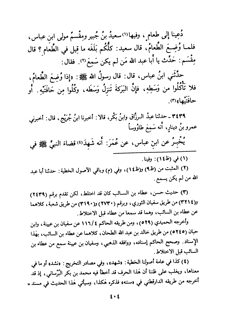 ٣٤٣٩ - حَدَّثَنَا عَبْدُ الرَّزَّاقِ، وَابْنُ بَكْرٍ قَالَا: أَخْبَرَنَا ابْنُ جُرَيْجٍ، قَالَ: أَخْبَرَنِي عَمْرُو بْنُ دِينَارٍ، أَنَّهُ سَمِعَ طَاوُسًا، يُخْبِرُ عَنِ ابْنِ عَبَّاسٍ، عَنْ عُمَرَ: أَنَّهُ شَهِدَ قَضَاءَ النَّبِيِّ صَلَّى اللهُ عَلَيْهِ وَسَلَّمَ فِي