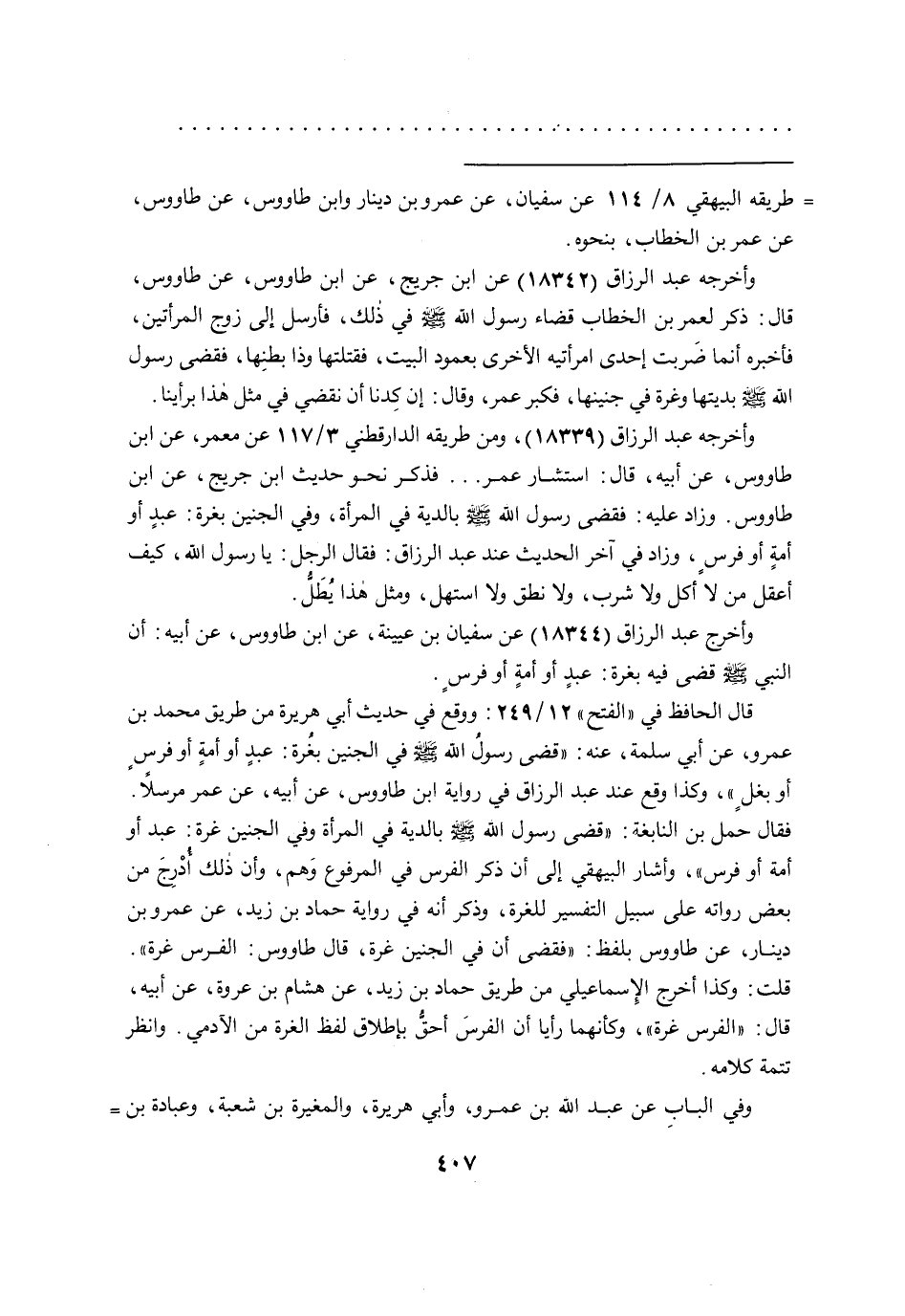 وأخرج عبد الرزاق (١٨٣٤٤) عن سفيان بن عيينة، عن ابن طاووس، عن أبيه: أن النبي صَلَّى اللهُ عَلَيْهِ وَسَلَّمَ قضى فيه بغرة: عبدٍ أو أمةٍ أو فرسٍ.