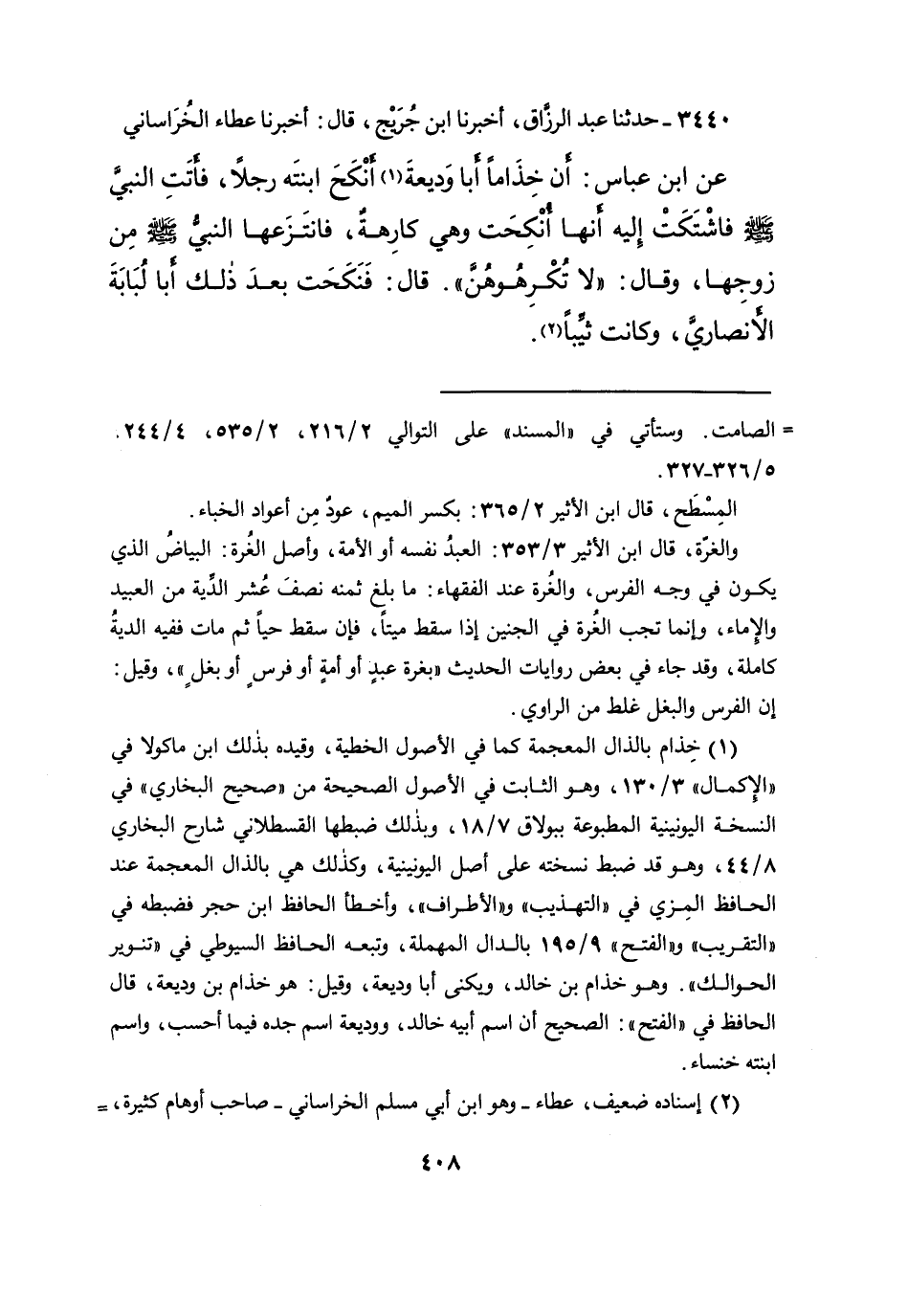 ٣٤٤٠ - حَدَّثَنَا عَبْدُ الرَّزَّاقِ، أَخْبَرَنَا ابْنُ جُرَيْجٍ، قَالَ: أَخْبَرَنَا عَطَاءٌ الْخُرَاسَانِيُّ، عَنِ ابْنِ عَبَّاسٍ: أَنَّ خِذَامًا أَبَا وَدِيعَةَ (١) ، أَنْكَحَ ابْنَتَهُ رَجُلًا، فَأَتَتِ النَّبِيَّ صَلَّى اللهُ عَلَيْهِ وَسَلَّمَ فَاشْتَكَتْ إِلَيْهِ أَنَّهَا أُنْكِحَتْ وَهِيَ كَارِهَةٌ، فَانْتَزَعَهَا النَّبِيُّ صَلَّى اللهُ عَلَيْهِ وَسَلَّمَ مِنْ زَوْجِهَا، وَقَالَ: " لَا تُكْرِهُوهُنَّ "، قَالَ: فَنَكَحَتْ بَعْدَ ذَلِكَ أَبَا لُبَابَةَ الْأَنْصَارِيَّ، وَكَانَتْ ثَيِّبًا (٢)