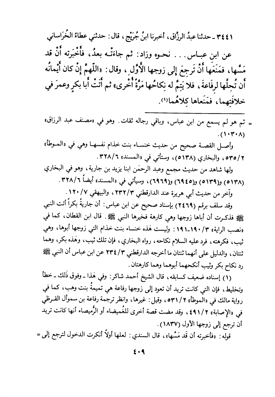 ٣٤٤١ - حَدَّثَنَا عَبْدُ الرَّزَّاقِ، أَخْبَرَنَا ابْنُ جُرَيْجٍ، قَالَ: حَدَّثَنِي عَطَاءٌ الْخُرَاسَانِيُّ، عَنِ ابْنِ عَبَّاسٍ، نَحْوَهُ وَزَادَ " ثُمَّ جَاءَتْهُ بَعْدُ، فَأَخْبَرَتْهُ أَنْ قَدْ مَسَّهَا، فَمَنَعَهَا أَنْ تَرْجِعَ إِلَى زَوْجِهَا الْأَوَّلِ، وَقَالَ: " اللهُمَّ إِنْ كَانَ إِيمَانُهُ أَنْ تُحِلَّهَا لِرَفَاعَةَ، فَلَا يَتِمَّ لَهُ نِكَاحُهَا مَرَّةً أُخْرَى " ثُمَّ أَتَتْ أَبَا بَكْرٍ وَعُمَرَ فِي خِلَافَتِهِمَا، فَمَنَعَاهَا كِلَاهُمَا (١)