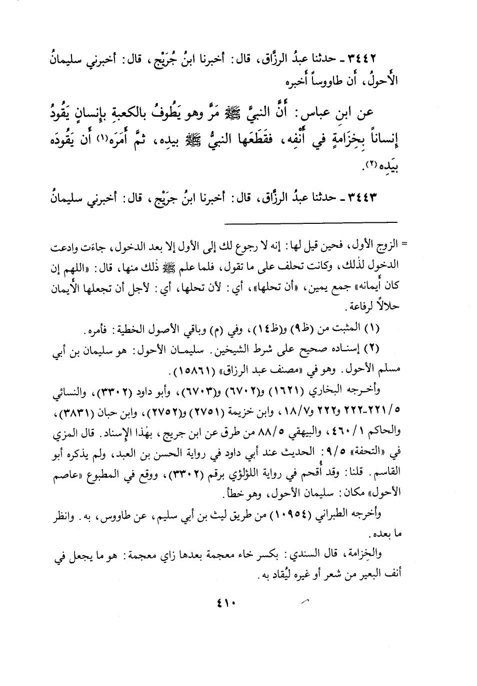 ٣٤٤٢ - حَدَّثَنَا عَبْدُ الرَّزَّاقِ، قَالَ: أَخْبَرَنَا ابْنُ جُرَيْجٍ، قَالَ: أَخْبَرَنِي سُلَيْمَانُ الْأَحْوَلُ، أَنَّ طَاوُسًا، أخْبَرَهُ عَنِ ابْنِ عَبَّاسٍ: " أَنَّ النَّبِيَّ صَلَّى اللهُ عَلَيْهِ وَسَلَّمَ مَرَّ وَهُوَ يَطُوفُ بِالْكَعْبَةِ بِإِنْسَانٍ يَقُودُ إِنْسَانًا بِخِزَامَةٍ فِي أَنْفِهِ، فَقَطَعَهَا النَّبِيُّ صَلَّى اللهُ عَلَيْهِ وَسَلَّمَ بِيَدِهِ، ثُمَّ أَمَرَهُ (١) أَنْ يَقُودَهُ بِيَدِهِ " (٢)