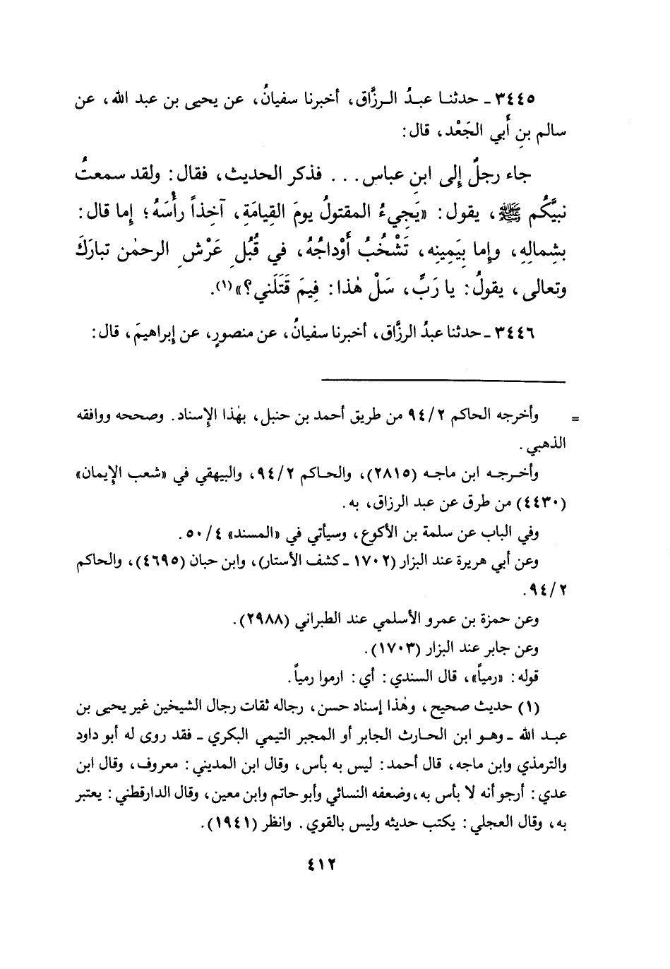 ٣٤٤٥ - حَدَّثَنَا عَبْدُ الرَّزَّاقِ، أَخْبَرَنَا سُفْيَانُ، عَنْ يَحْيَى بْنِ عَبْدِ اللهِ، عَنْ سَالِمِ بْنِ أَبِي الْجَعْدِ، قَالَ: جَاءَ رَجُلٌ إِلَى ابْنِ عَبَّاسٍ فَذَكَرَ الْحَدِيثَ، فَقَالَ: وَلَقَدْ سَمِعْتُ نَبِيَّكُمْ صَلَّى اللهُ عَلَيْهِ وَسَلَّمَ يَقُولُ: " يَجِيءُ الْمَقْتُولُ يَوْمَ الْقِيَامَةِ، آخِذًا رَأْسَهُ، إِمَّا قَالَ: بِشِمَالِهِ، وَإِمَّا بِيَمِينِهِ، تَشْخَبُ أَوْدَاجُهُ، فِي قُبُلِ عَرْشِ الرَّحْمَنِ تَبَارَكَ وَتَعَالَى، يَقُولُ: يَا رَبِّ، سَلْ هَذَا: فِيمَ قَتَلَنِي؟ " (١)