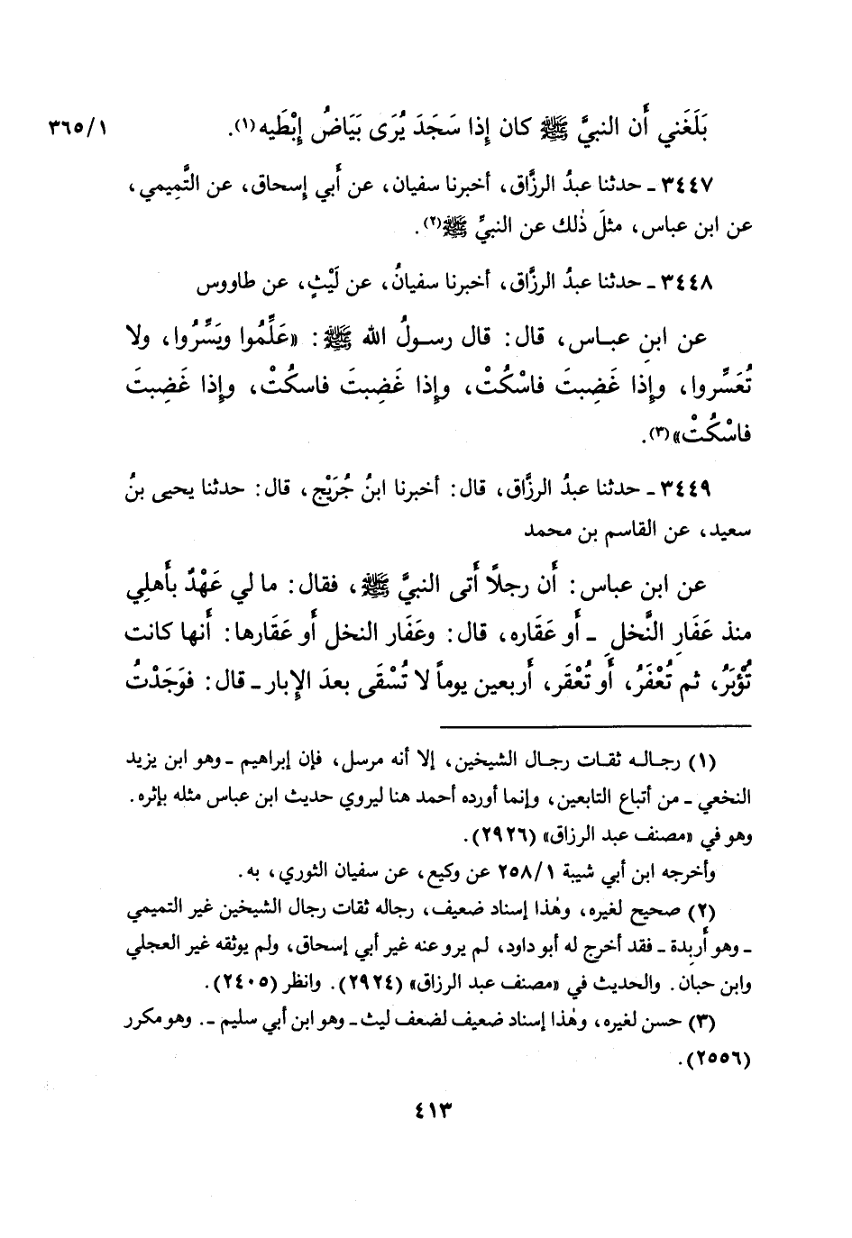 ٣٤٤٨ - حَدَّثَنَا عَبْدُ الرَّزَّاقِ، أَخْبَرَنَا سُفْيَانُ، عَنْ لَيْثٍ، عَنْ طَاوُسٍ، عَنِ ابْنِ عَبَّاسٍ، قَالَ: قَالَ رَسُولُ اللهِ صَلَّى اللهُ عَلَيْهِ وَسَلَّمَ: " عَلِّمُوا وَيَسِّرُوا، وَلَا تُعَسِّرُوا، وَإِذَا غَضِبْتَ فَاسْكُتْ، وَإِذَا غَضِبْتَ فَاسْكُتْ، وَإِذَا غَضِبْتَ فَاسْكُتْ " (٣)