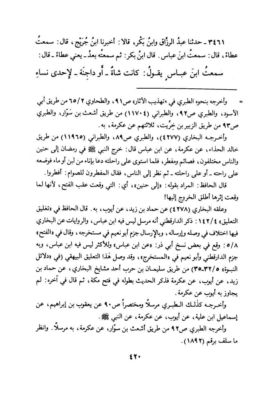 ٣٤٦١ - حَدَّثَنَا عَبْدُ الرَّزَّاقِ، وَابْنُ بَكْرٍ، قَالَا: أَخْبَرَنَا ابْنُ جُرَيْجٍ، قَالَ: سَمِعْتُ عَطَاءً، قَالَ: سَمِعْتُ ابْنَ عَبَّاسٍ، قَالَ: ابْنُ بَكْرٍ: ثُمَّ سَمِعْتُهُ بَعْدُ - يَعْنِي عَطَاءً -، قَالَ: سَمِعْتُ ابْنَ عَبَّاسٍ يَقُولُ: كَانَتْ شَاةٌ - أَوْ دَاجِنَةٌ - لِإِحْدَى نِسَاءِ