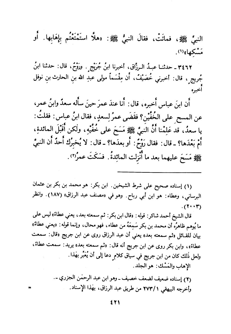 ٣٤٦٢ - حَدَّثَنَا عَبْدُ الرَّزَّاقِ، أَخْبَرَنَا ابْنُ جُرَيْجٍ، وَرَوْحٌ، قَالَ: حَدَّثَنَا ابْنُ جُرَيْجٍ، قَالَ: أَخْبَرَنِي خُصَيْفٌ، أَنَّ مِقْسَمًا، مَوْلَى عَبْدِ اللهِ بْنِ الْحَارِثِ بْنِ نَوْفَلٍ، أخْبَرَهُ أَنَّ ابْنَ عَبَّاسٍ أَخْبَرَهُ، قَالَ: أَنَا عِنْدَ عُمَرَ حِينَ سَأَلَهُ سَعْدٌ، وَابْنُ عُمَرَ، عَنِ الْمَسْحِ عَلَى الْخُفَّيْنِ؟ فَقَضَى عُمَرُ لِسَعْدٍ، فَقَالَ ابْنُ عَبَّاسٍ: فَقُلْتُ: يَا سَعْدُ، قَدْ عَلِمْنَا أَنَّ النَّبِيَّ صَلَّى اللهُ عَلَيْهِ وَسَلَّمَ " مَسَحَ عَلَى خُفَّيْهِ "، وَلَكِنْ أَقَبْلَ الْمَائِدَةِ، أَمْ بَعْدَهَا؟ - قَالَ: فَقَالَ رَوْحٌ: أَوْ بَعْدَهَا؟ - قَالَ: لَا يُخْبِرُكَ أَحَدٌ أَنَّ النَّبِيَّ صَلَّى اللهُ عَلَيْهِ وَسَلَّمَ مَسَحَ عَلَيْهِمَا بَعْدَمَا أُنْزِلَتِ الْمَائِدَةُ، فَسَكَتَ عُمَرُ (٢)