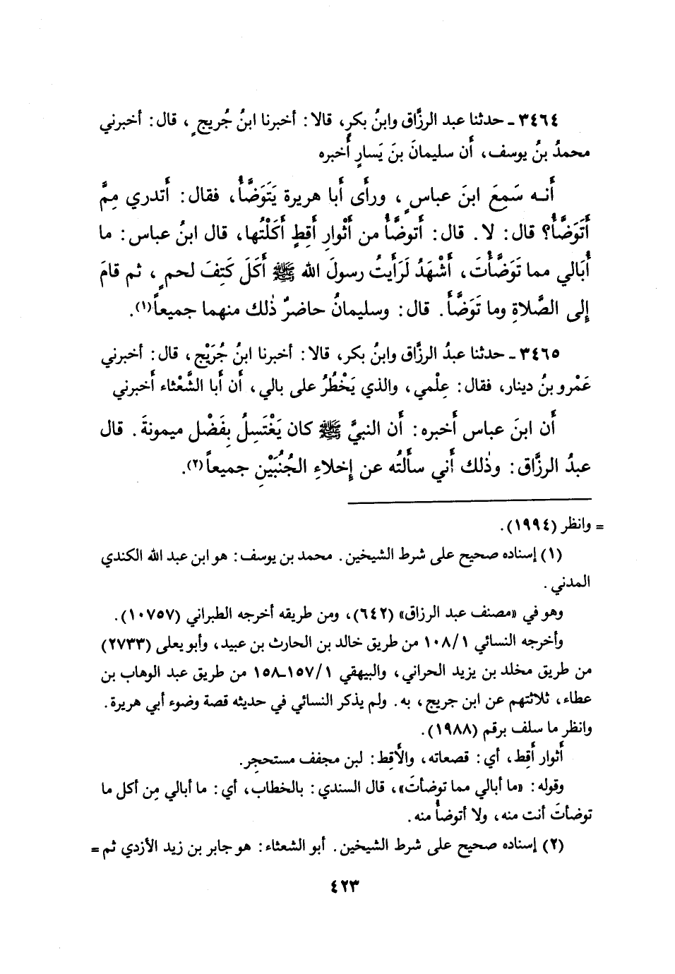 ٣٤٦٤ - حَدَّثَنَا عَبْدُ الرَّزَّاقِ، وَابْنُ بَكْرٍ، قَالَا: أَخْبَرَنَا ابْنُ جُرَيْجٍ، قَالَ: أَخْبَرَنِي مُحَمَّدُ بْنُ يُوسُفَ، أَنَّ سُلَيْمَانَ بْنَ يَسَارٍ، أخْبَرَهُ أَنَّهُ، سَمِعَ ابْنَ عَبَّاسٍ، وَرَأَى أَبَا هُرَيْرَةَ يَتَوَضَّأُ، فَقَالَ: أَتَدْرِي مِمَّا أَتَوَضَّأُ؟ قَالَ: لَا، قَالَ: أَتَوَضَّأُ مِنْ أَثْوَارِ أَقِطٍ أَكَلْتُهَا، قَالَ ابْنُ عَبَّاسٍ: مَا أُبَالِي مِمَّا تَوَضَّأْتَ، أَشْهَدُ لَرَأَيْتُ " رَسُولَ اللهِ صَلَّى اللهُ عَلَيْهِ وَسَلَّمَ أَكَلَ كَتِفَ لَحْمٍ، ثُمَّ قَامَ إِلَى الصَّلَاةِ وَمَا تَوَضَّأَ " قَالَ: " وَسُلَيْمَانُ حَاضِرٌ ذَلِكَ مِنْهُمَا جَمِيعًا " (١)