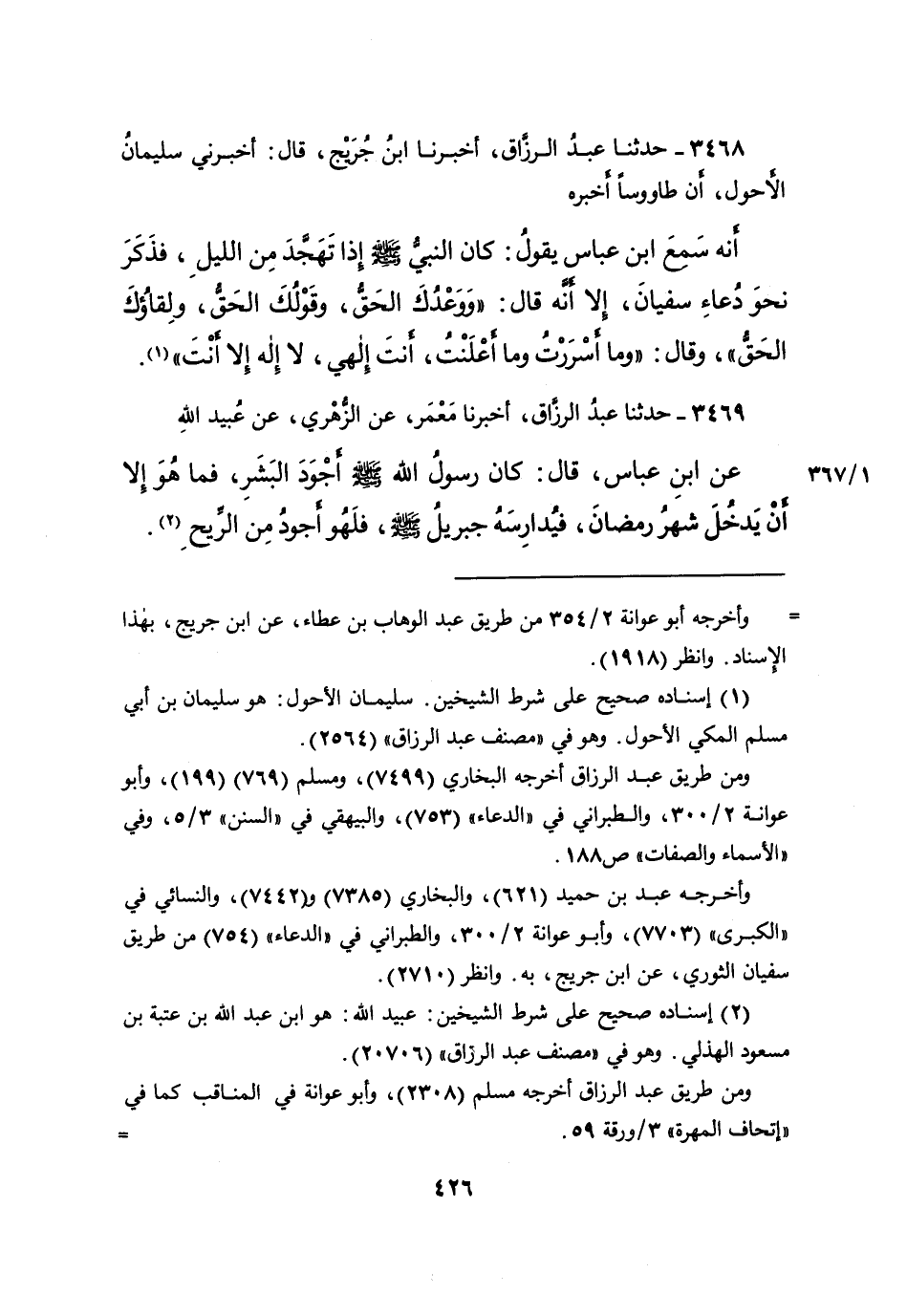 ٣٤٦٨ - حَدَّثَنَا عَبْدُ الرَّزَّاقِ، أَخْبَرَنَا ابْنُ جُرَيْجٍ، قَالَ: أَخْبَرَنِي سُلَيْمَانُ الْأَحْوَلُ، أَنَّ طَاوُسًا، أخْبَرَهُ أَنَّهُ، سَمِعَ ابْنَ عَبَّاسٍ يَقُولُ: كَانَ النَّبِيُّ صَلَّى اللهُ عَلَيْهِ وَسَلَّمَ إِذَا تَهَجَّدَ مِنَ اللَّيْلِ، فَذَكَرَ نَحْوَ دُعَاءِ سُفْيَانَ، إِلَّا أَنَّهُ قَالَ: " وَوََعْدُكَ الْحَقُّ، وَقَوْلُكَ الْحَقُّ، وَلِقَاؤُكَ الْحَقُّ " وَقَالَ: " وَمَا أَسْرَرْتُ وَمَا أَعْلَنْتُ، أَنْتَ إِلَهِي، لَا إِلَهَ إِلَّا أَنْتَ " (١)