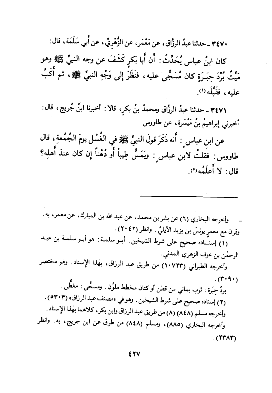 ٣٤٧٠ - حَدَّثَنَا عَبْدُ الرَّزَّاقِ، عَنْ مَعْمَرٍ، عَنِ الزُّهْرِيِّ، عَنْ أَبِي سَلَمَةَ، قَالَ: كَانَ ابْنُ عَبَّاسٍ يُحَدِّثُ: أَنَّ أَبَا بَكْرٍ " كَشَفَ عَنْ وَجْهِ النَّبِيِّ صَلَّى اللهُ عَلَيْهِ وَسَلَّمَ وَهُوَ مَيِّتٌ بُرْدَ حِبَرَةٍ كَانَ مُسَجًّى عَلَيْهِ، فَنَظَرَ إِلَى وَجْهِ النَّبِيِّ صَلَّى اللهُ عَلَيْهِ وَسَلَّمَ، ثُمَّ أَكَبَّ عَلَيْهِ فَقَبَّلَهُ " (١)
