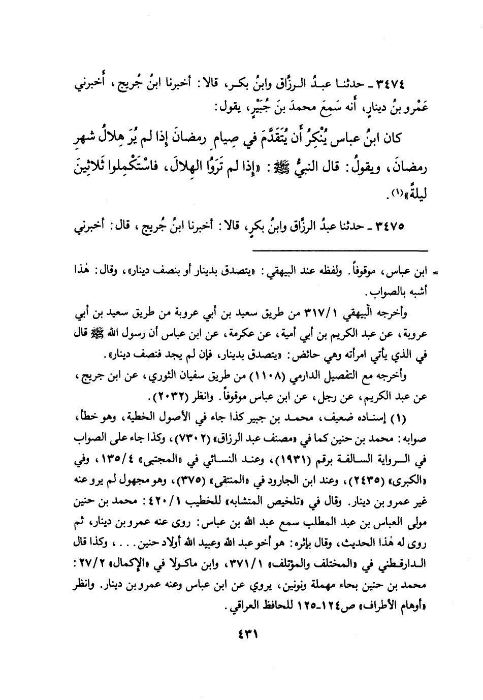 ٣٤٧٤ - حَدَّثَنَا عَبْدُ الرَّزَّاقِ، وَابْنُ بَكْرٍ، قَالَا: أَخْبَرَنَا ابْنُ جُرَيْجٍ، أَخْبَرَنِي عَمْرُو بْنُ دِينَارٍ، أَنَّهُ سَمِعَ مُحَمَّدَ بْنَ جُبَيْرٍ يَقُولُ: كَانَ ابْنُ عَبَّاسٍ يُنْكِرُ أَنْ يُتَقَدَّمَ فِي صِيَامِ رَمَضَانَ إِذَا لَمْ يُرَ هِلَالُ شَهْرِ رَمَضَانَ، وَيَقُولُ: قَالَ النَّبِيُّ صَلَّى اللهُ عَلَيْهِ وَسَلَّمَ: " إِذَا لَمْ تَرَوْا الْهِلَالَ، فَاسْتَكْمِلُوا ثَلَاثِينَ لَيْلَةً " (١)
