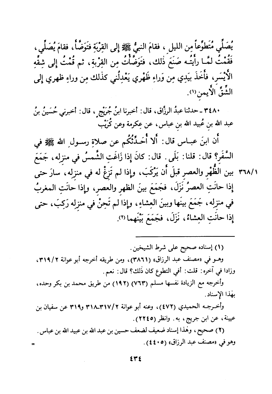 ٣٤٨٠ - حَدَّثَنَا عَبْدُ الرَّزَّاقِ، قَالَ: أَخْبَرَنَا ابْنُ جُرَيْجٍ، قَالَ: أَخْبَرَنِي حُسَيْنُ بْنُ عَبْدِ اللهِ بْنِ عُبَيْدِ اللهِ بْنِ عَبَّاسٍ، عَنْ عِكْرِمَةَ، وَعَنْ كُرَيْبٍ، أَنَّ ابْنَ عَبَّاسٍ، قَالَ: أَلَا أُحَدِّثُكُمْ عَنْ صَلَاةِ رَسُولِ اللهِ صَلَّى اللهُ عَلَيْهِ وَسَلَّمَ فِي السَّفَرِ؟ قَالَ: قُلْنَا: بَلَى، قَالَ: " كَانَ إِذَا زَاغَتِ الشَّمْسُ فِي مَنْزِلِهِ، جَمَعَ بَيْنَ الظُّهْرِ، وَالْعَصْرِ قَبْلَ أَنْ يَرْكَبَ، وَإِذَا لَمْ تَزِغْ لَهُ فِي مَنْزِلِهِ، سَارَ حَتَّى إِذَا حَانَتِ الْعَصْرُ نَزَلَ، فَجَمَعَ بَيْنَ الظُّهْرِ وَالْعَصْرِ، وَإِذَا حَانَتِ الْمَغْرِبُ فِي مَنْزِلِهِ، جَمَعَ بَيْنَهَا وَبَيْنَ الْعِشَاءِ، وَإِذَا لَمْ تَحِنْ فِي مَنْزِلِهِ رَكِبَ، حَتَّى إِذَا حَانَتِ الْعِشَاءُ، نَزَلَ، فَجَمَعَ بَيْنَهُمَا " (٢)