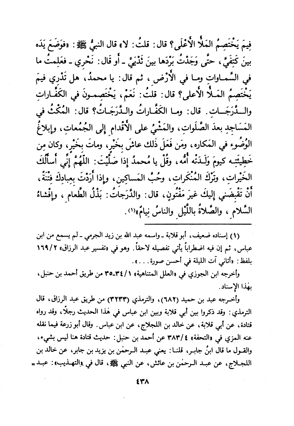فِيمَ يَخْتَصِمُ الْمَلَأُ الْأَعْلَى؟ قَالَ: قُلْتُ: لَا " قَالَ النَّبِيُّ صَلَّى اللهُ عَلَيْهِ وَسَلَّمَ: " فَوَضَعَ يَدَهُ بَيْنَ كَتِفَيَّ، حَتَّى وَجَدْتُ بَرْدَهَا بَيْنَ ثَدْيَيَّ - أَوْ قَالَ: نَحْرِي - فَعَلِمْتُ مَا فِي السَّمَاوَاتِ وَمَا فِي الْأَرْضِ، ثُمَّ قَالَ: يَا مُحَمَّدُ، هَلْ تَدْرِي فِيمَ يَخْتَصِمُ الْمَلَأُ الْأَعْلَى؟ قَالَ: قُلْتُ: نَعَمْ، يَخْتَصِمُونَ فِي الْكَفَّارَاتِ وَالدَّرَجَاتِ، قَالَ: وَمَا الْكَفَّارَاتُ وَالدَّرَجَاتُ؟ قَالَ: الْمُكْثُ فِي الْمَسَاجِدِ بَعْدَ الصَّلَوَاتِ، وَالْمَشْيُ عَلَى الْأَقْدَامِ إِلَى الْجَمَاعَاتِ، وَإِبْلَاغُ الْوُضُوءِ فِي الْمَكَارِهِ، وَمَنْ فَعَلَ ذَلِكَ عَاشَ بِخَيْرٍ، وَمَاتَ بِخَيْرٍ، وَكَانَ مِنْ خَطِيئَتِهِ كَيَوْمِ وَلَدَتْهُ أُمُّهُ، وَقُلْ يَا مُحَمَّدُ إِذَا صَلَّيْتَ: اللهُمَّ إِنِّي أَسْأَلُكَ الْخَيْرَاتِ، وَتَرْكَ الْمُنْكَرَاتِ، وَحُبَّ الْمَسَاكِينِ، وَإِذَا أَرَدْتَ بِعِبَادِكَ فِتْنَةً، أَنْ تَقْبِضَنِي إِلَيْكَ غَيْرَ مَفْتُونٍ، قَالَ: وَالدَّرَجَاتُ: بَذْلُ الطَّعَامِ، وَإِفْشَاءُ السَّلَامِ، وَالصَّلَاةُ بِاللَّيْلِ وَالنَّاسُ نِيَامٌ " (١)