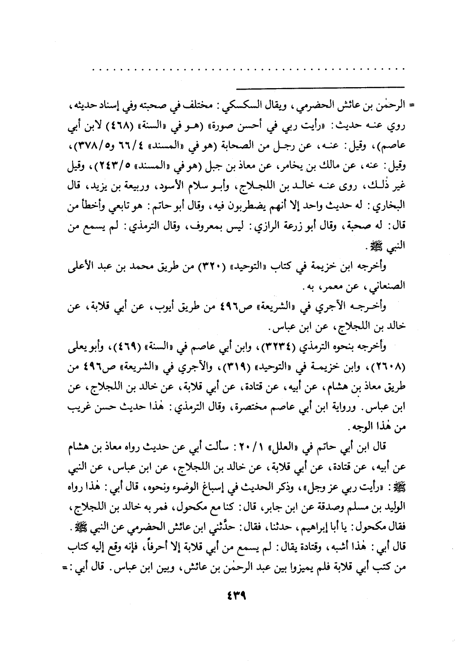 = الرحمن بن عائش الحضرمي، ويقال السكسكي: مختلف في صحبته وفي إسناد حديثه، روي عنه حديث: "رأيت ربي في أحسن صورة" (هو في "السنة" (١٤٦٨) لابن أبي عاصم) ، وقيل: عنه، عن رجل من الصحابة (هو في "المسند" ٤/٦٦ و٥/٣٧٨) ، وقيل: عنه، عن مالك بن يخامر، عن معاذ بن جبل (هو في "المسند" ٥/٢٤٣) ، وقيل غير ذلك، روى عنه خالد بن اللجلاج، وأبو سلام الأسود، وربيعة بن يزيد، قال البخاري: له حديث واحد إلا أنهم يضطربون فيه، وقال أبو حاتم: هو تابعي وأخطأ من قال: له صحبة، وقال أبو زرعة الرازي: ليس بمعروف، وقال الترمذي: لم يسمع من النبي صَلَّى اللهُ عَلَيْهِ وَسَلَّمَ.