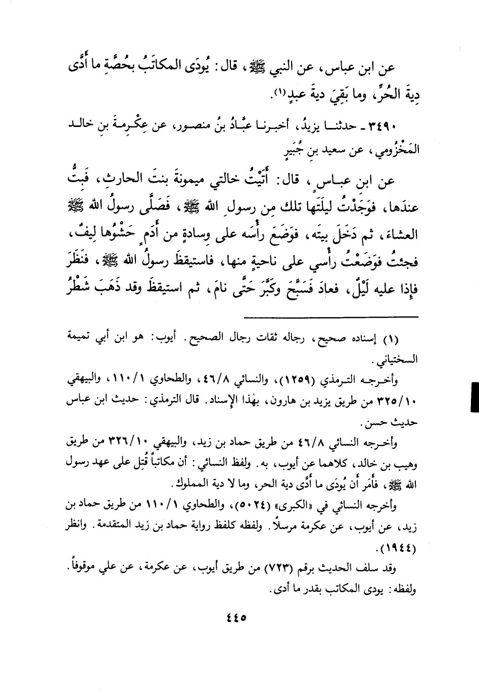 عَنِ ابْنِ عَبَّاسٍ، عَنِ النَّبِيِّ صَلَّى اللهُ عَلَيْهِ وَسَلَّمَ قَالَ: " يُودَى الْمُكَاتَبُ بِحِصَّةِ مَا أَدَّى دِيَةَ الْحُرِّ، وَمَا بَقِيَ دِيَةَ عَبْدٍ " (١)